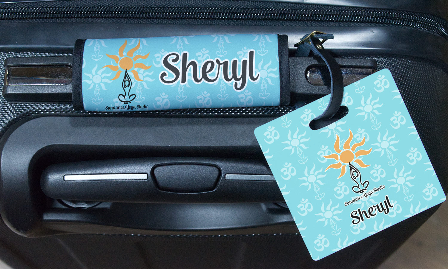 This calming design is dominantly a gorgeous light teal with the the Sundance logo, as well as the om symbol, repeating in the background. The main logo is prominently displayed front and center. The logo is a simple drawing of a figure doing the lotus pose with a sun rising above them. "Sundance Yoga Studio" is written beneath the logo. You personalization goes directly under the logo to create a finished design.
