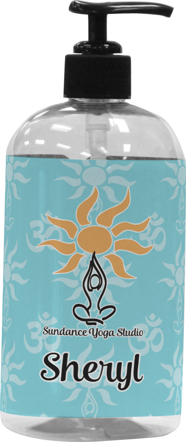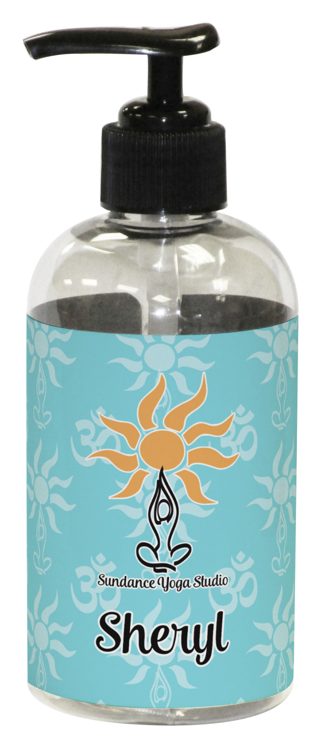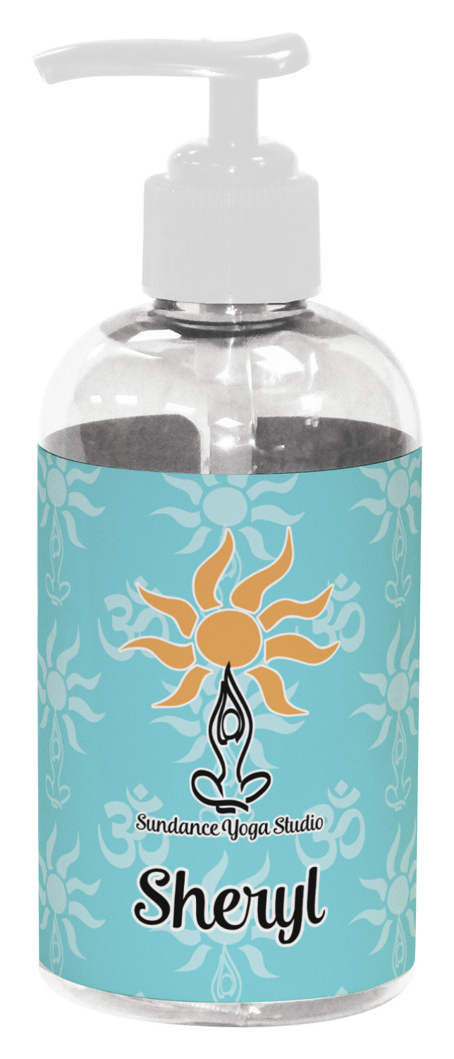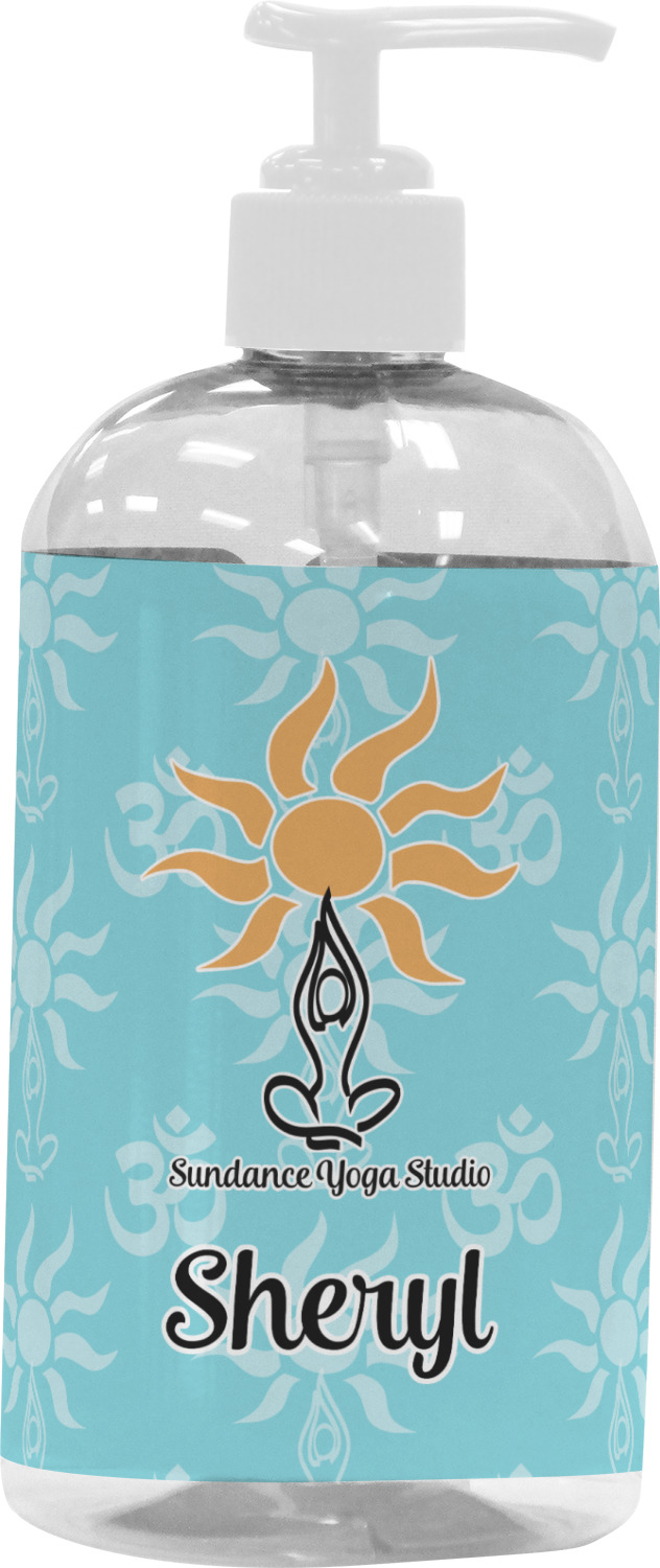 This calming design is dominantly a gorgeous light teal with the the Sundance logo, as well as the om symbol, repeating in the background. The main logo is prominently displayed front and center. The logo is a simple drawing of a figure doing the lotus pose with a sun rising above them. "Sundance Yoga Studio" is written beneath the logo. You personalization goes directly under the logo to create a finished design.