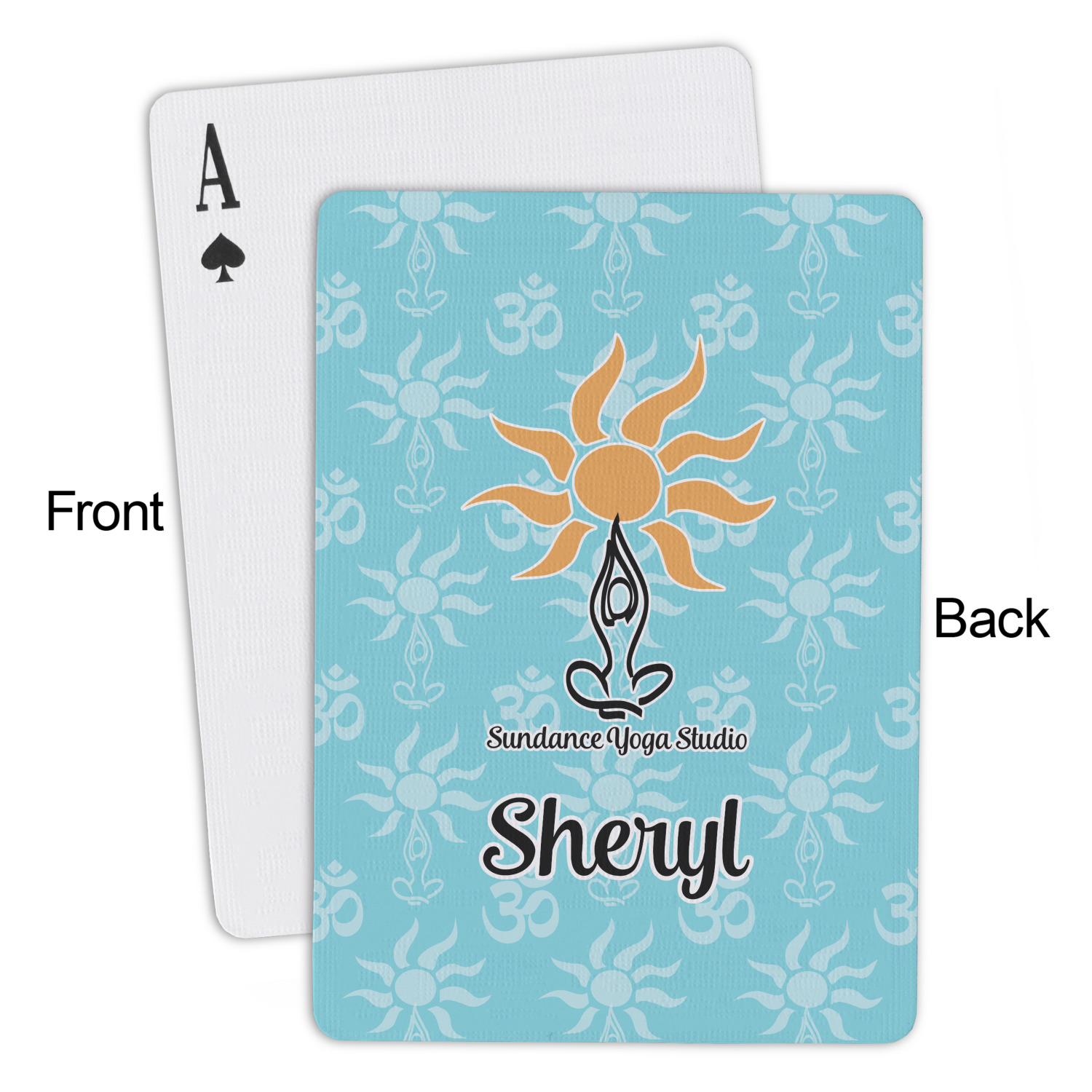 The customization / personalization is printed on the back side. The playing cards have a low gloss coating on both sides. The cards are packaged in a clear plastic box.