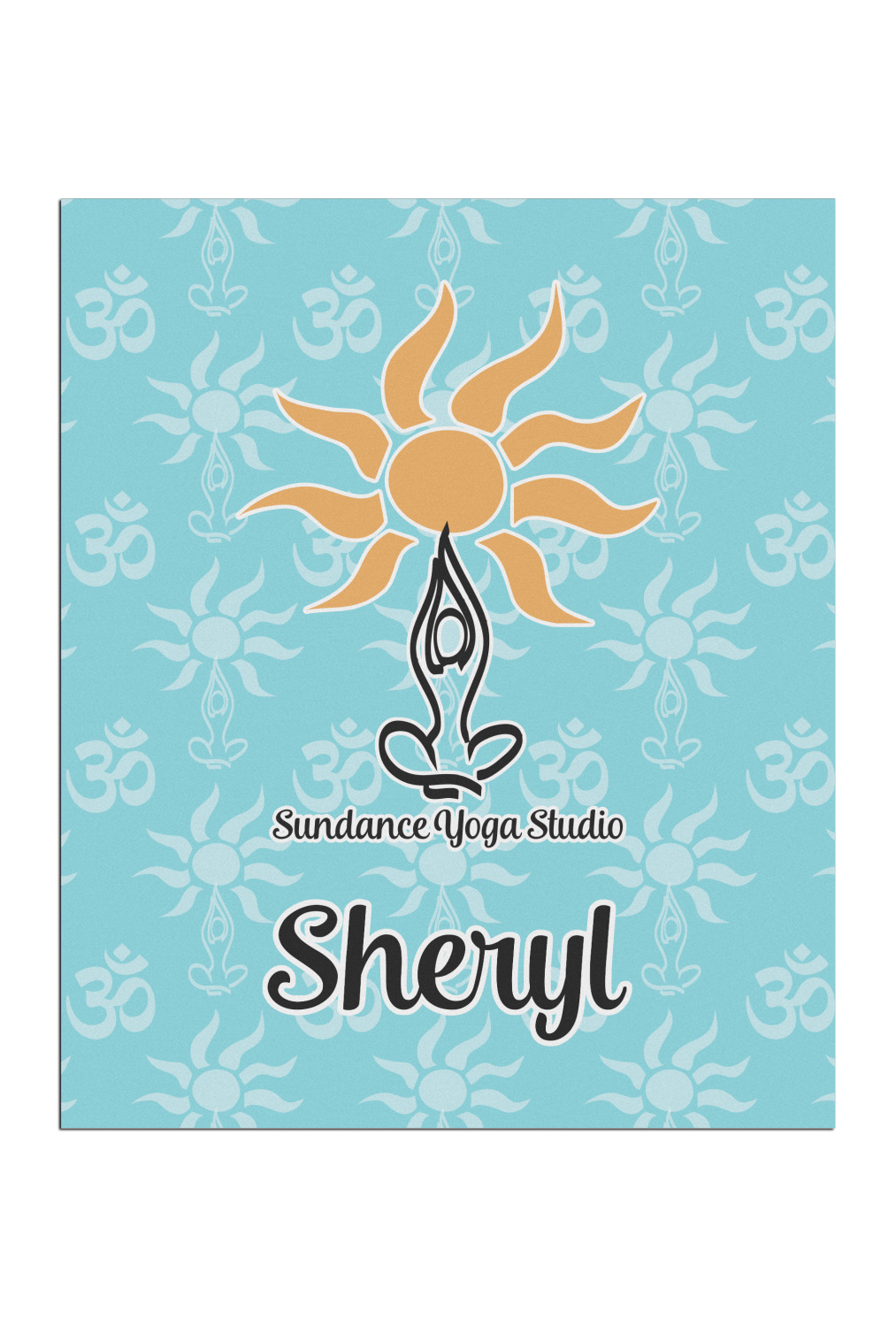 This calming design is dominantly a gorgeous light teal with the the Sundance logo, as well as the om symbol, repeating in the background. The main logo is prominently displayed front and center. The logo is a simple drawing of a figure doing the lotus pose with a sun rising above them. "Sundance Yoga Studio" is written beneath the logo. You personalization goes directly under the logo to create a finished design.