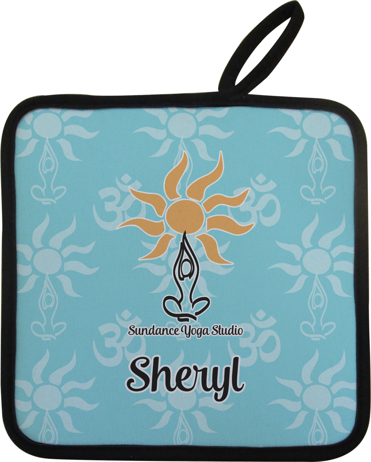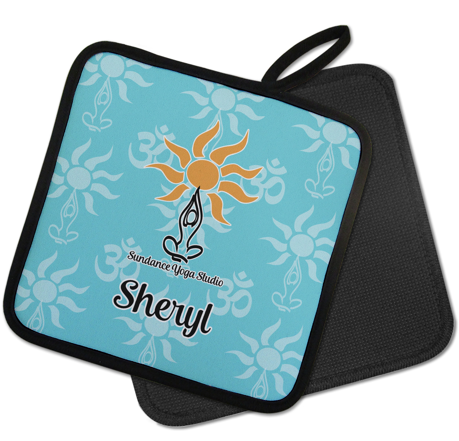 Our personalized pot holders feature a neoprene front that displays your personalization in vibrant colors. The backing of the hot pot holder is rubberized; the textured backing allows you to have a great grip when using this custom pot holder. The two materials are joined with a sleek, black trim, and the holder also includes an attached loop for hanging and storage. The pot holder is approximately 8.75 inches by 8.75 inches and 0.25 inches tall, while the fabric loop is 2.5 inches long. You can purchase a kitchen pot holder by itself or as a set of 2. We also offer a set including one pot holder and one oven mitt.