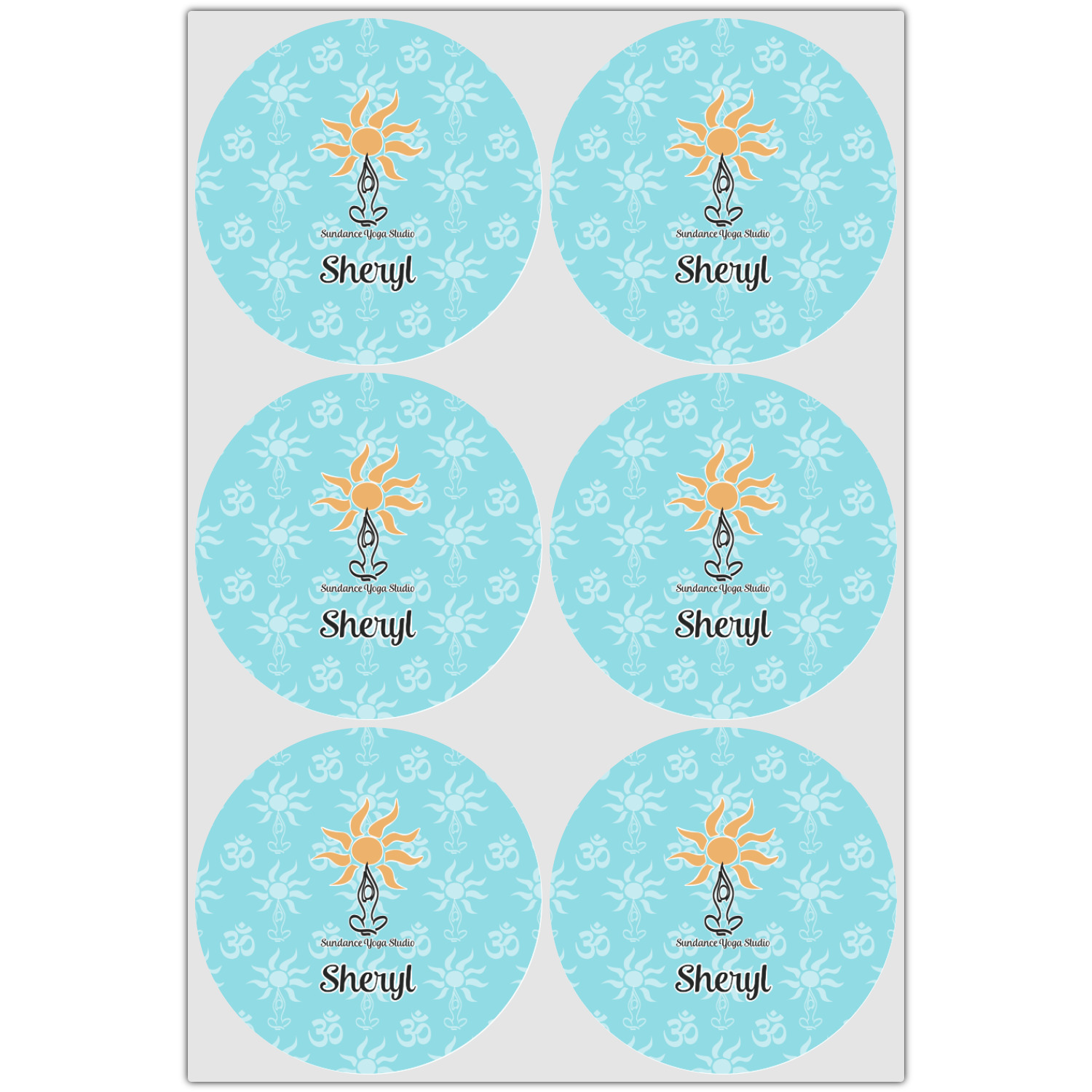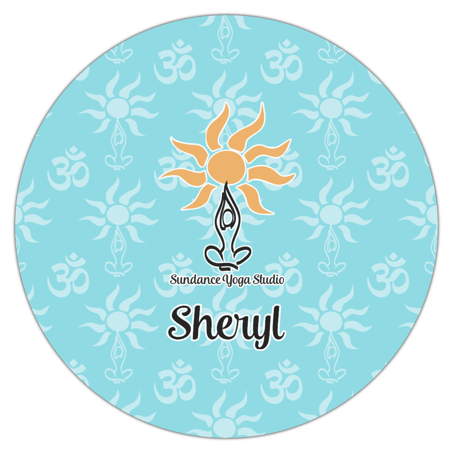 This calming design is dominantly a gorgeous light teal with the the Sundance logo, as well as the om symbol, repeating in the background. The main logo is prominently displayed front and center. The logo is a simple drawing of a figure doing the lotus pose with a sun rising above them. "Sundance Yoga Studio" is written beneath the logo. You personalization goes directly under the logo to create a finished design.