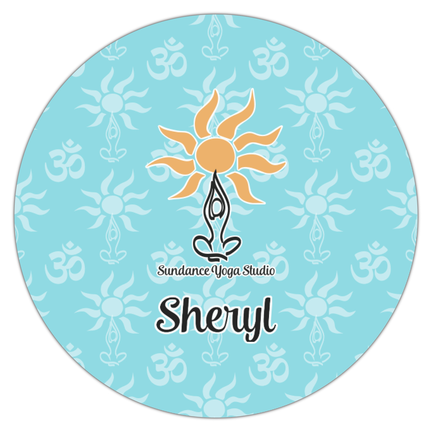 This calming design is dominantly a gorgeous light teal with the the Sundance logo, as well as the om symbol, repeating in the background. The main logo is prominently displayed front and center. The logo is a simple drawing of a figure doing the lotus pose with a sun rising above them. "Sundance Yoga Studio" is written beneath the logo. You personalization goes directly under the logo to create a finished design.
