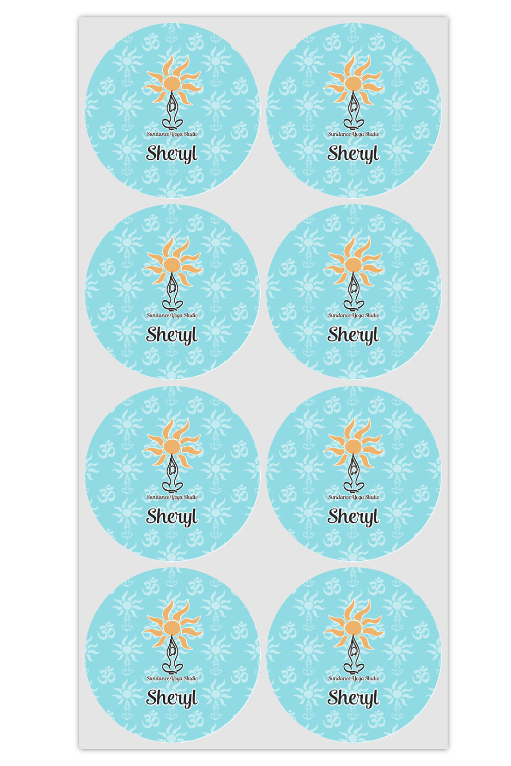 This calming design is dominantly a gorgeous light teal with the the Sundance logo, as well as the om symbol, repeating in the background. The main logo is prominently displayed front and center. The logo is a simple drawing of a figure doing the lotus pose with a sun rising above them. "Sundance Yoga Studio" is written beneath the logo. You personalization goes directly under the logo to create a finished design.
