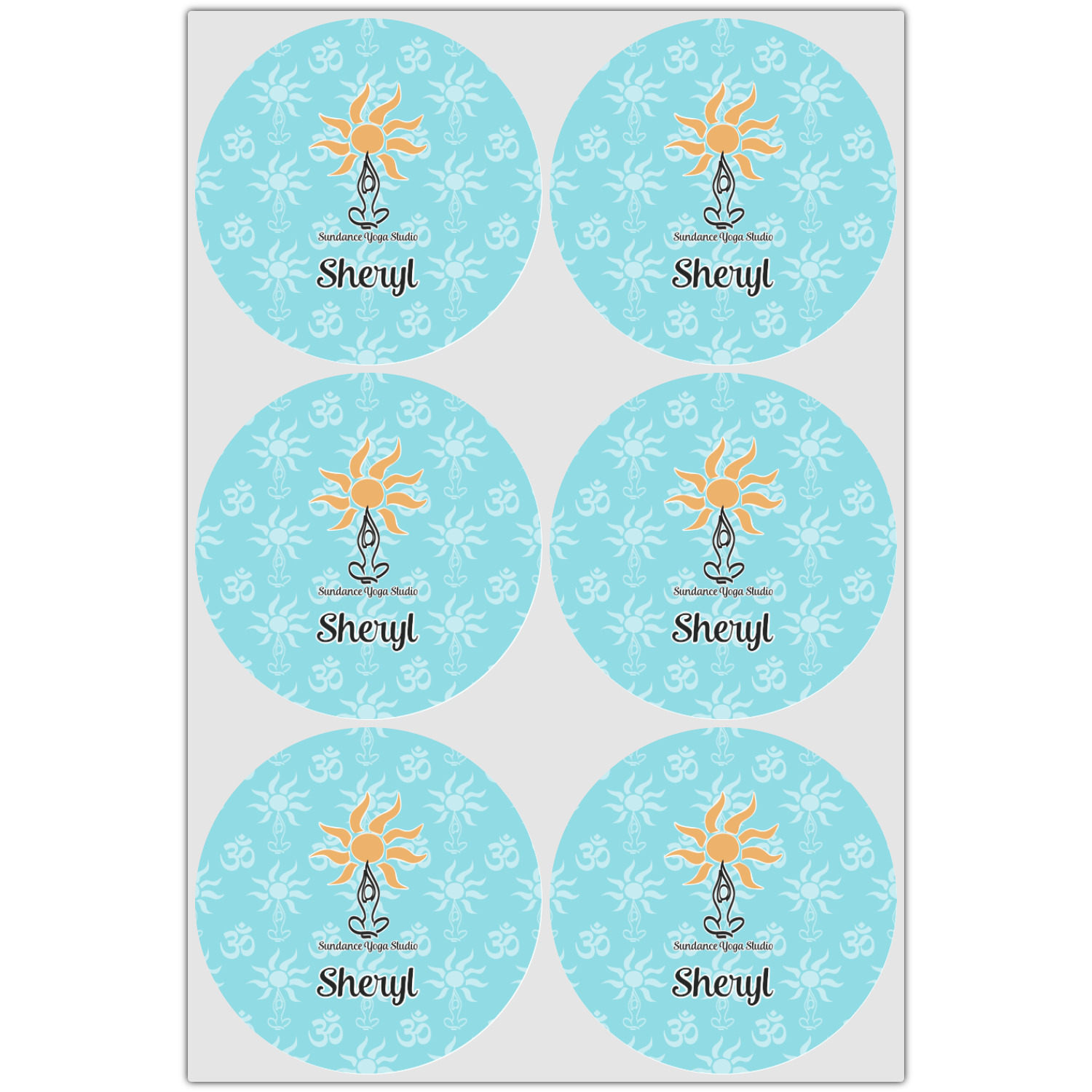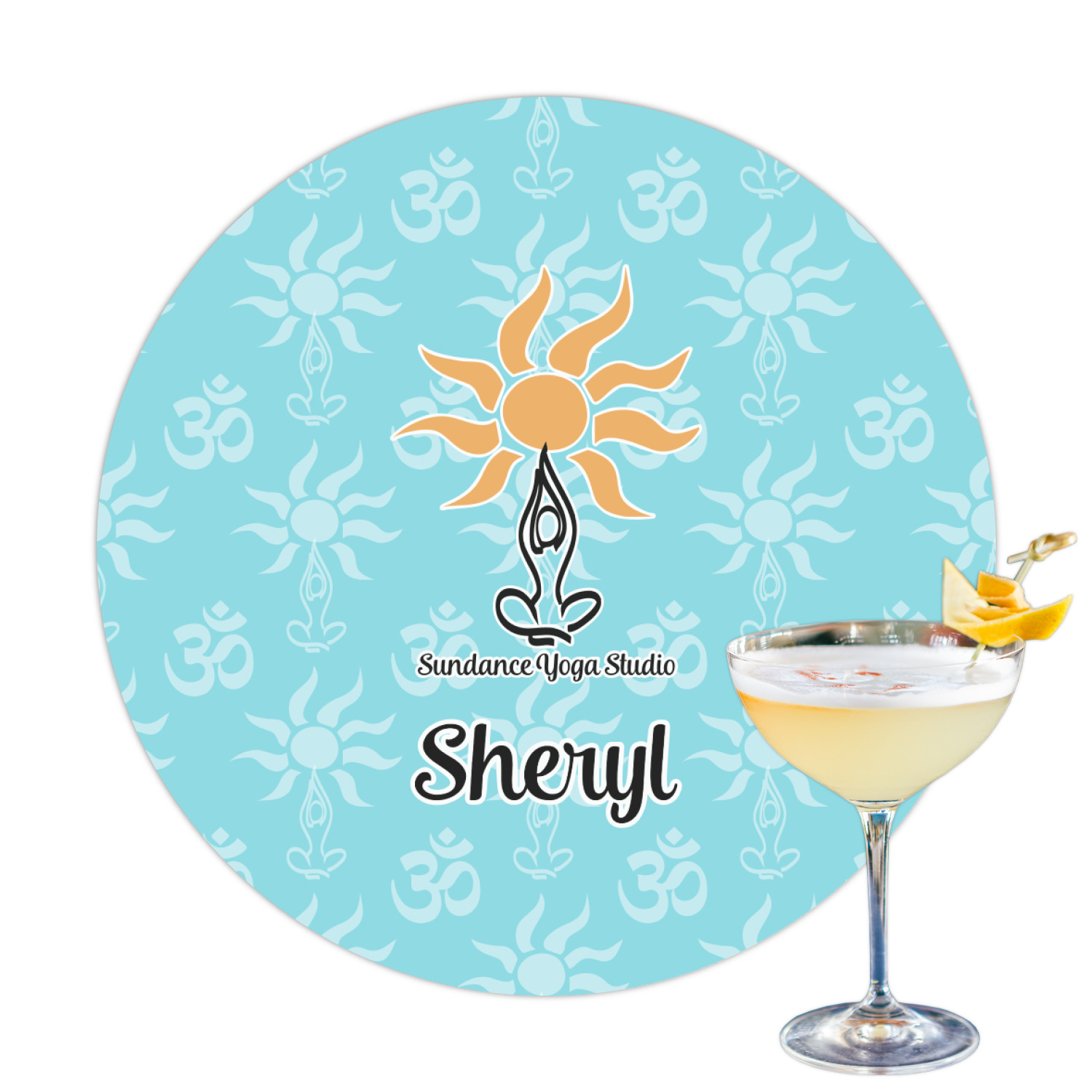 This calming design is dominantly a gorgeous light teal with the the Sundance logo, as well as the om symbol, repeating in the background. The main logo is prominently displayed front and center. The logo is a simple drawing of a figure doing the lotus pose with a sun rising above them. "Sundance Yoga Studio" is written beneath the logo. You personalization goes directly under the logo to create a finished design.