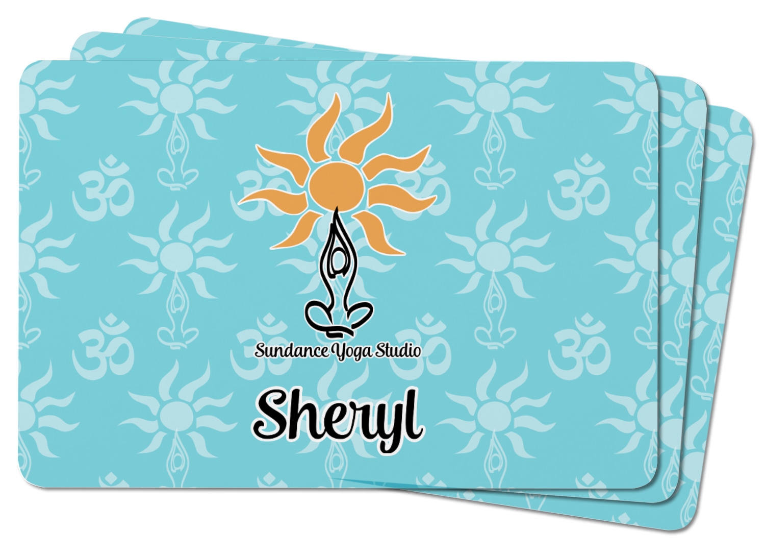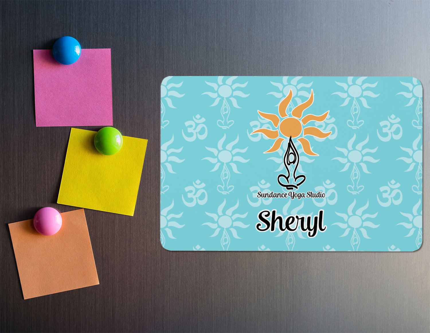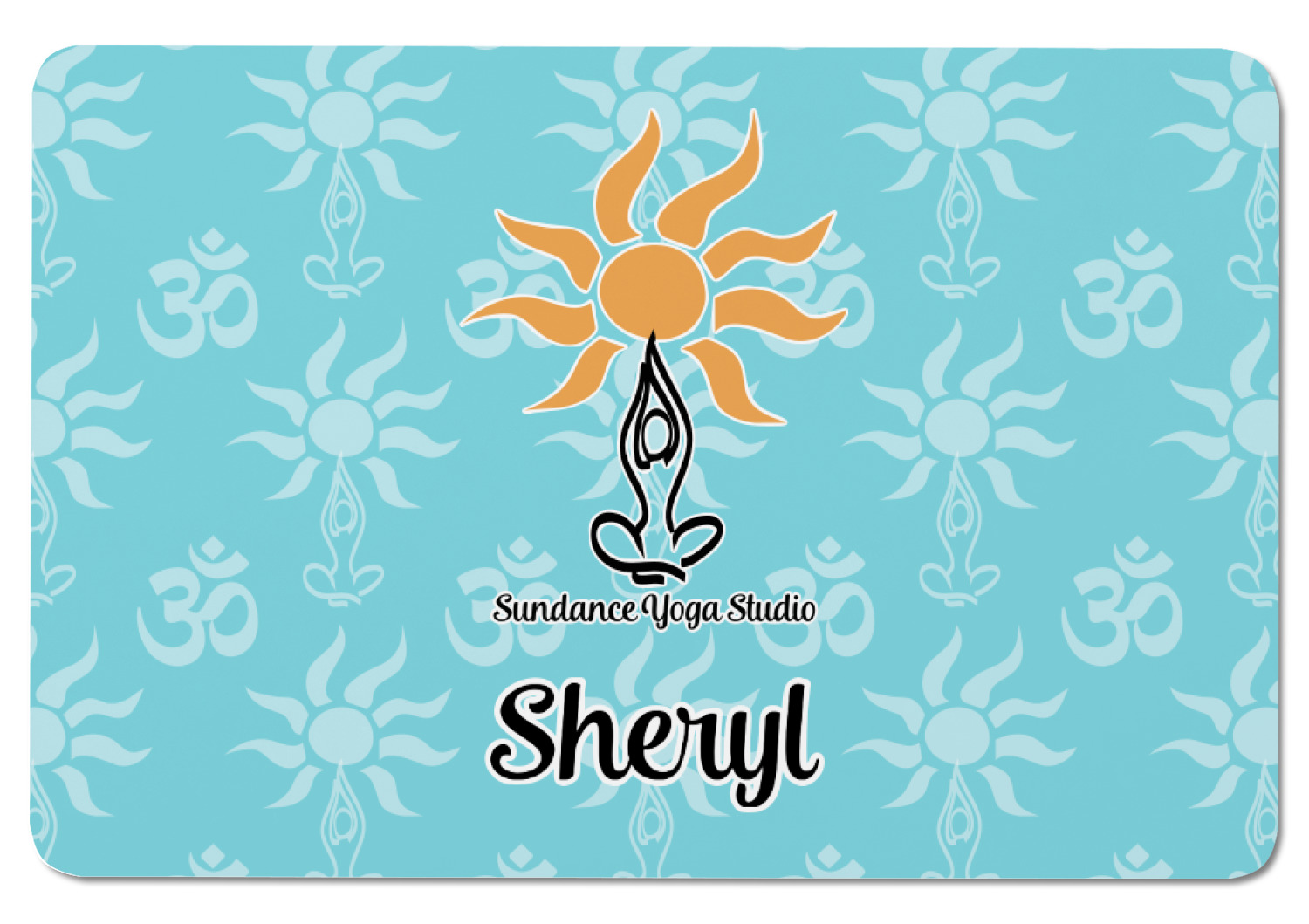 This calming design is dominantly a gorgeous light teal with the the Sundance logo, as well as the om symbol, repeating in the background. The main logo is prominently displayed front and center. The logo is a simple drawing of a figure doing the lotus pose with a sun rising above them. "Sundance Yoga Studio" is written beneath the logo. You personalization goes directly under the logo to create a finished design.