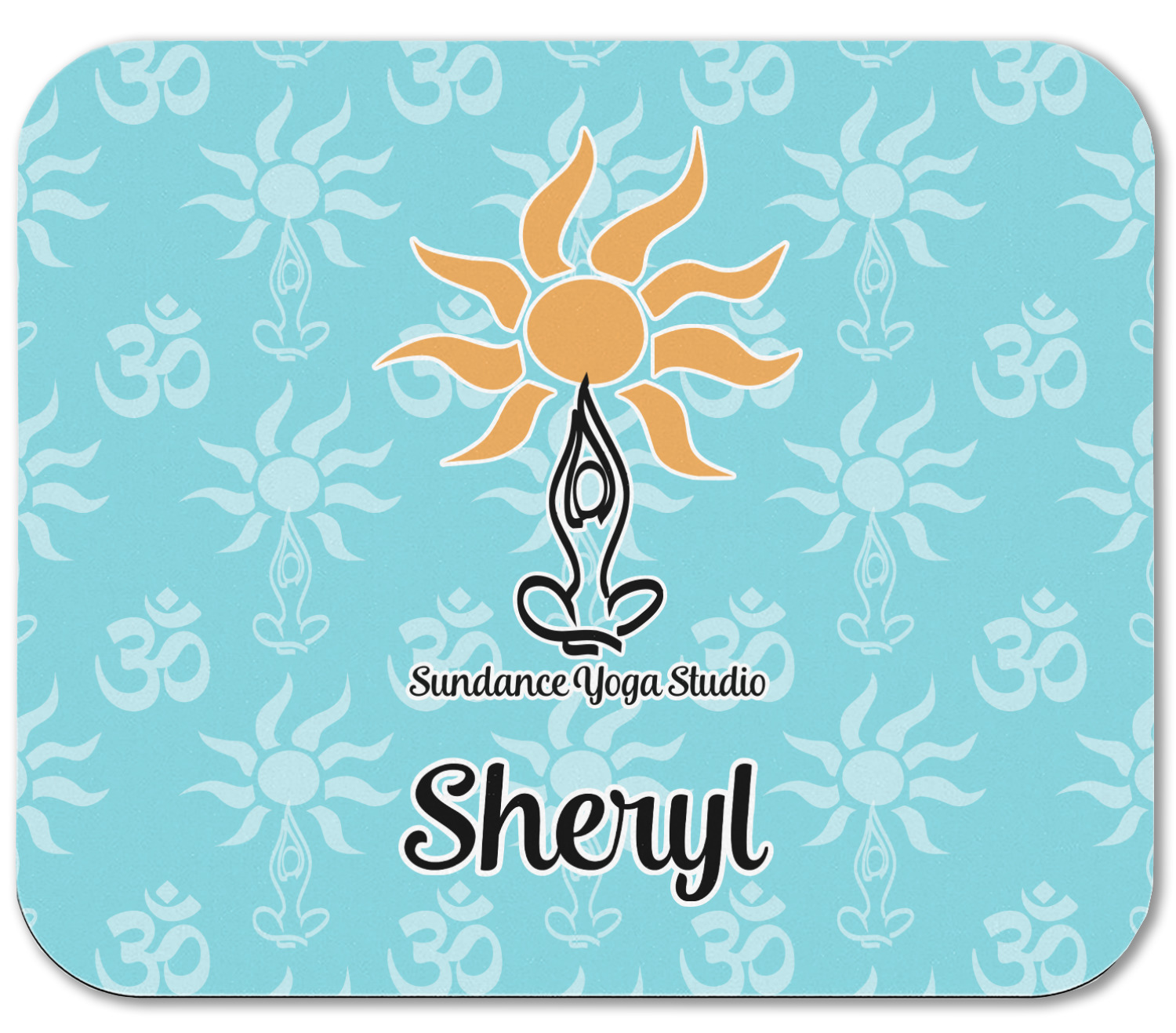 This calming design is dominantly a gorgeous light teal with the the Sundance logo, as well as the om symbol, repeating in the background. The main logo is prominently displayed front and center. The logo is a simple drawing of a figure doing the lotus pose with a sun rising above them. "Sundance Yoga Studio" is written beneath the logo. You personalization goes directly under the logo to create a finished design.