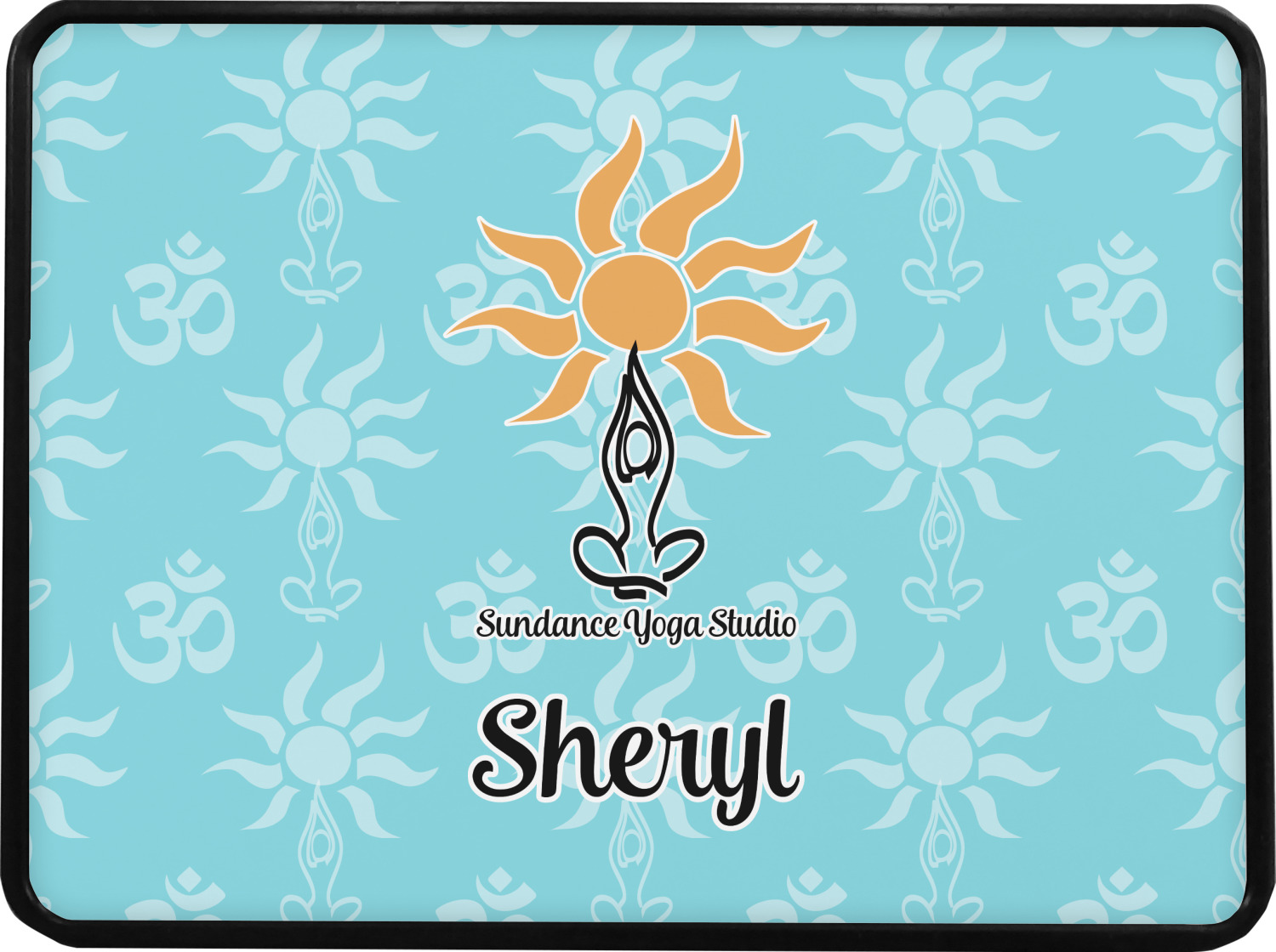 This calming design is dominantly a gorgeous light teal with the the Sundance logo, as well as the om symbol, repeating in the background. The main logo is prominently displayed front and center. The logo is a simple drawing of a figure doing the lotus pose with a sun rising above them. "Sundance Yoga Studio" is written beneath the logo. You personalization goes directly under the logo to create a finished design.
