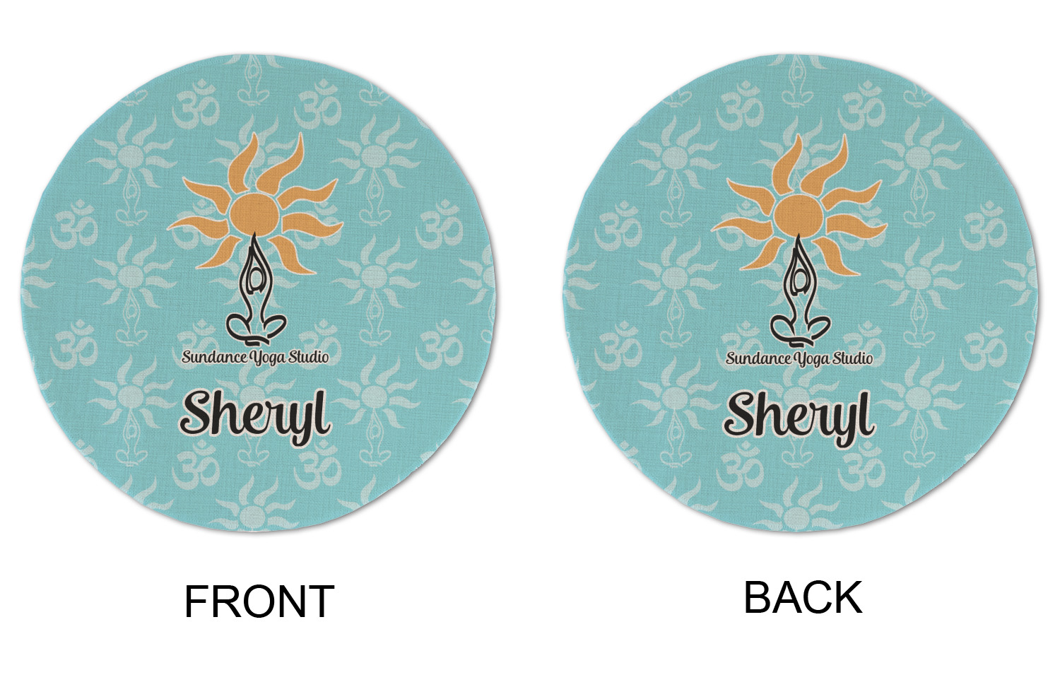 This calming design is dominantly a gorgeous light teal with the the Sundance logo, as well as the om symbol, repeating in the background. The main logo is prominently displayed front and center. The logo is a simple drawing of a figure doing the lotus pose with a sun rising above them. "Sundance Yoga Studio" is written beneath the logo. You personalization goes directly under the logo to create a finished design.