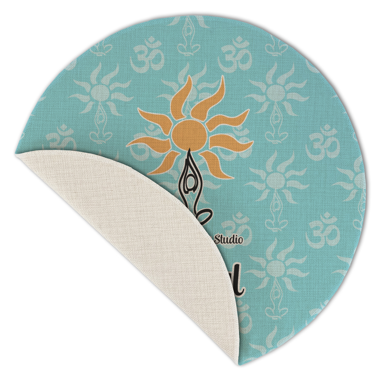 This calming design is dominantly a gorgeous light teal with the the Sundance logo, as well as the om symbol, repeating in the background. The main logo is prominently displayed front and center. The logo is a simple drawing of a figure doing the lotus pose with a sun rising above them. "Sundance Yoga Studio" is written beneath the logo. You personalization goes directly under the logo to create a finished design.