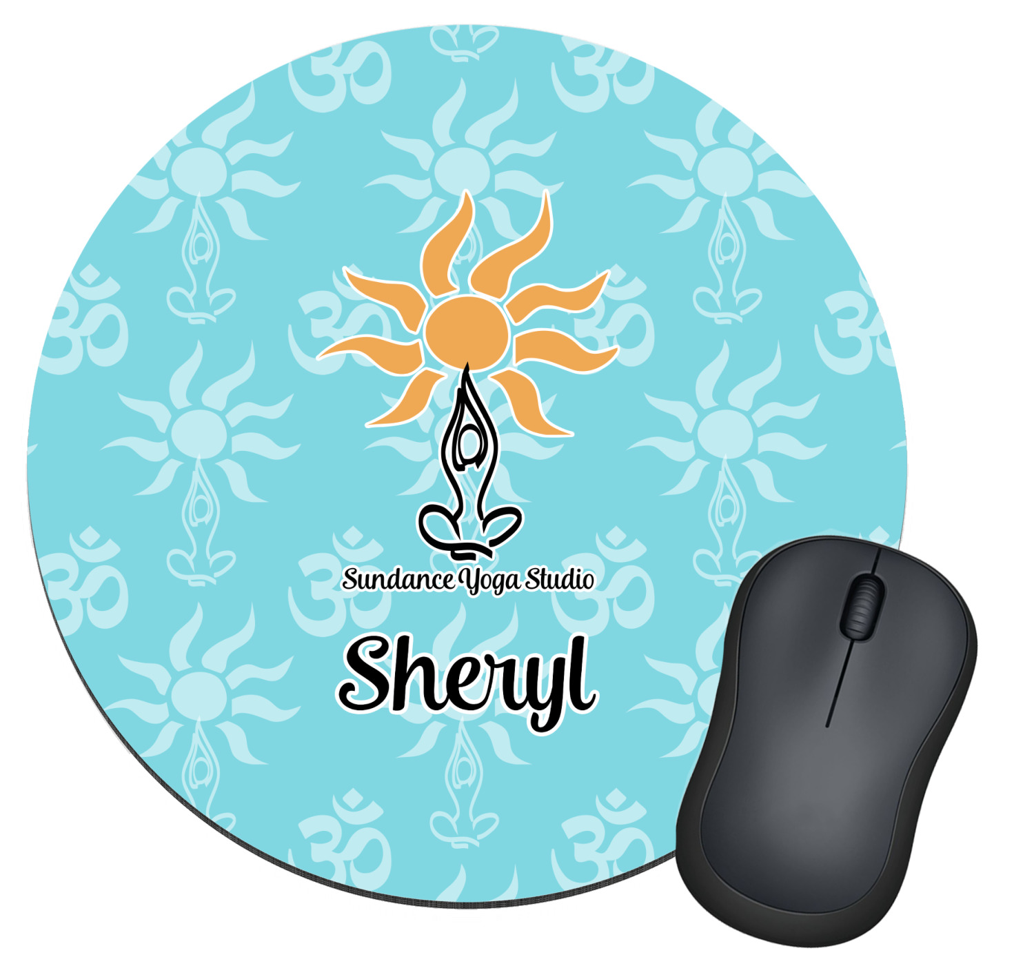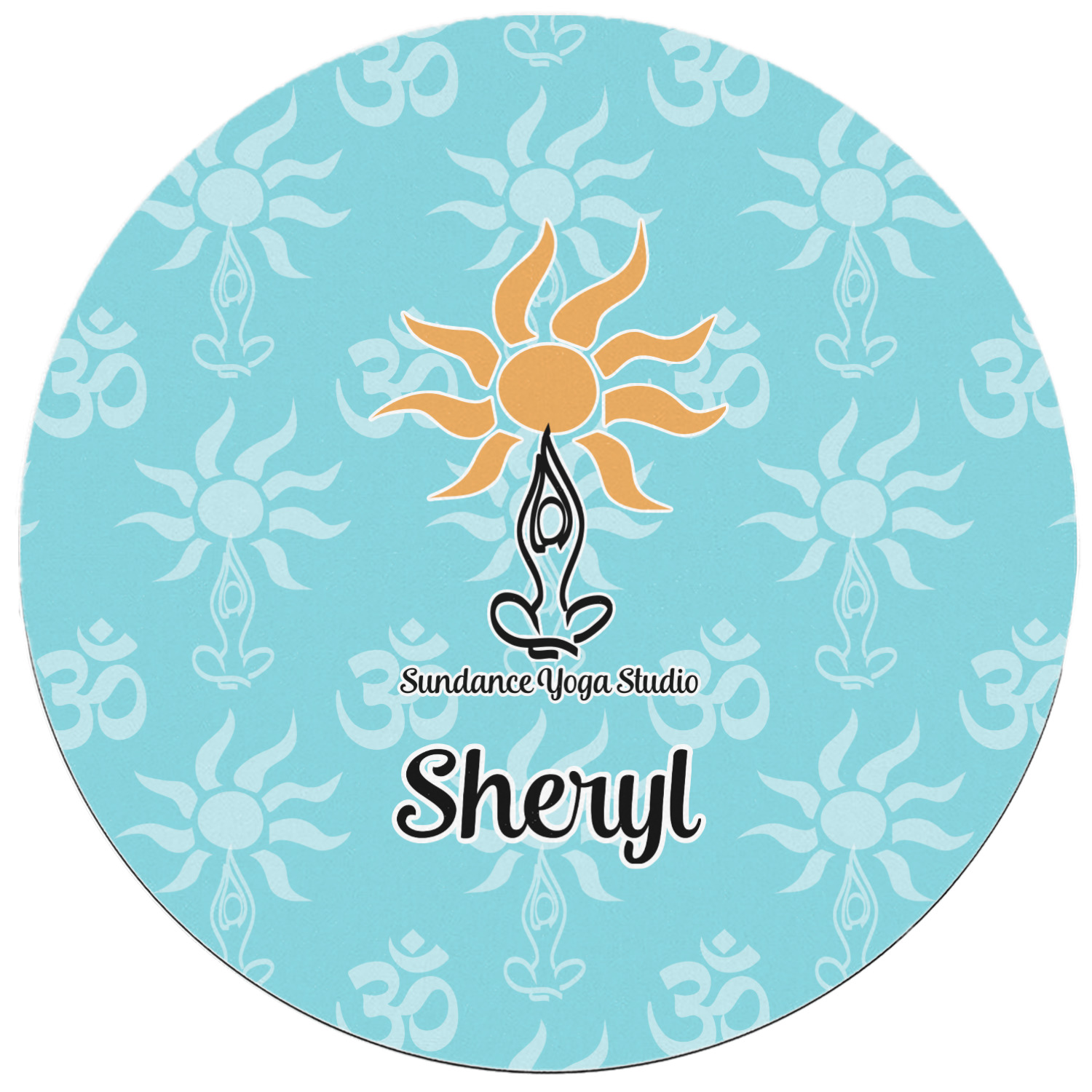This calming design is dominantly a gorgeous light teal with the the Sundance logo, as well as the om symbol, repeating in the background. The main logo is prominently displayed front and center. The logo is a simple drawing of a figure doing the lotus pose with a sun rising above them. "Sundance Yoga Studio" is written beneath the logo. You personalization goes directly under the logo to create a finished design.