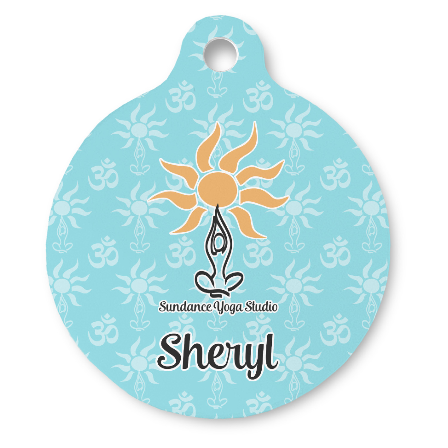 This calming design is dominantly a gorgeous light teal with the the Sundance logo, as well as the om symbol, repeating in the background. The main logo is prominently displayed front and center. The logo is a simple drawing of a figure doing the lotus pose with a sun rising above them. "Sundance Yoga Studio" is written beneath the logo. You personalization goes directly under the logo to create a finished design.