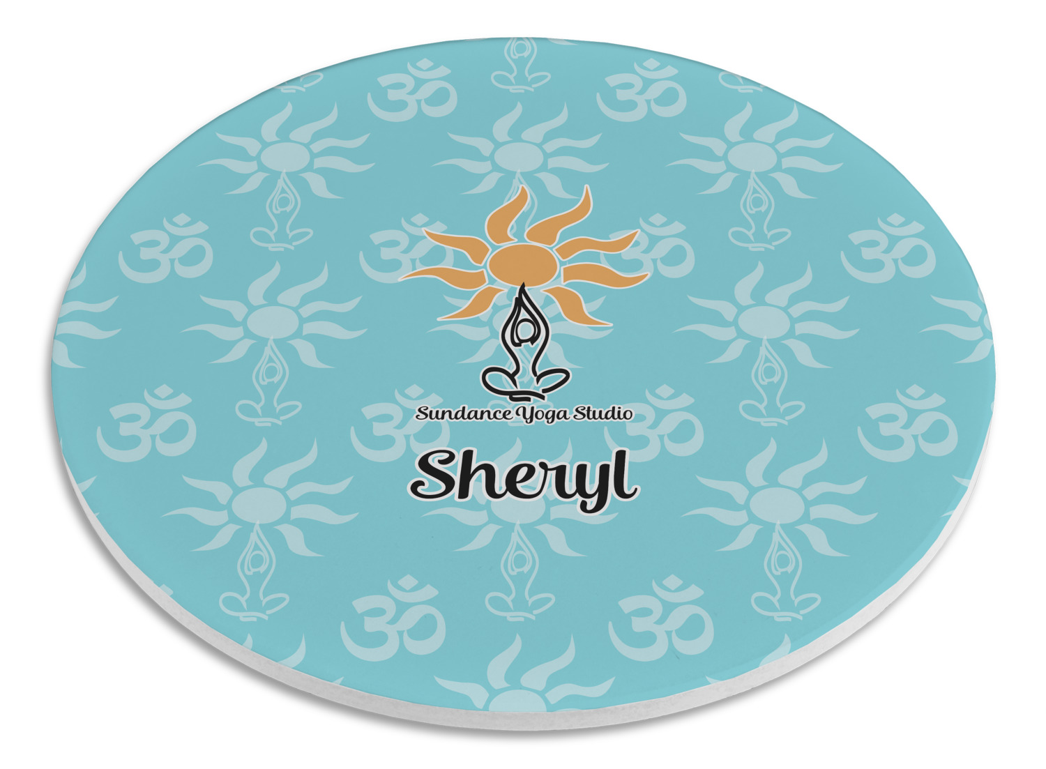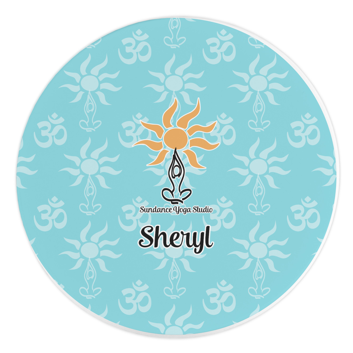 This calming design is dominantly a gorgeous light teal with the the Sundance logo, as well as the om symbol, repeating in the background. The main logo is prominently displayed front and center. The logo is a simple drawing of a figure doing the lotus pose with a sun rising above them. "Sundance Yoga Studio" is written beneath the logo. You personalization goes directly under the logo to create a finished design.