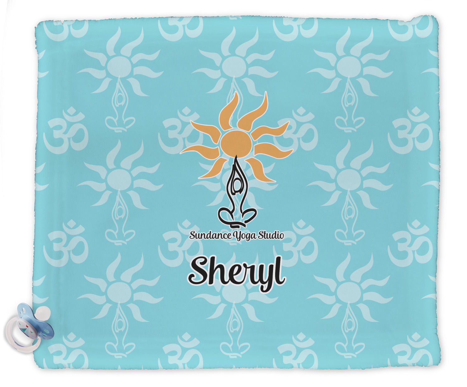 This calming design is dominantly a gorgeous light teal with the the Sundance logo, as well as the om symbol, repeating in the background. The main logo is prominently displayed front and center. The logo is a simple drawing of a figure doing the lotus pose with a sun rising above them. "Sundance Yoga Studio" is written beneath the logo. You personalization goes directly under the logo to create a finished design.