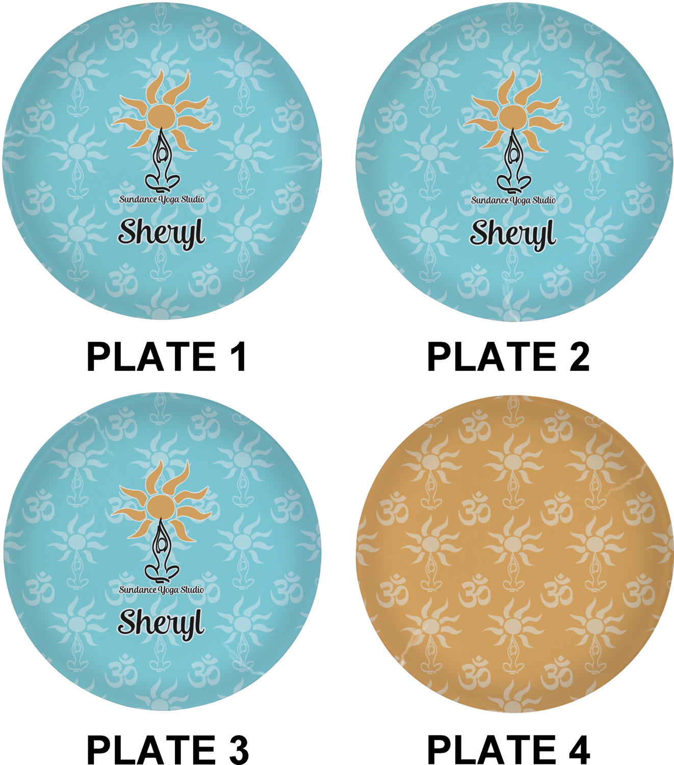 This calming design is dominantly a gorgeous light teal with the the Sundance logo, as well as the om symbol, repeating in the background. The main logo is prominently displayed front and center. The logo is a simple drawing of a figure doing the lotus pose with a sun rising above them. "Sundance Yoga Studio" is written beneath the logo. You personalization goes directly under the logo to create a finished design.