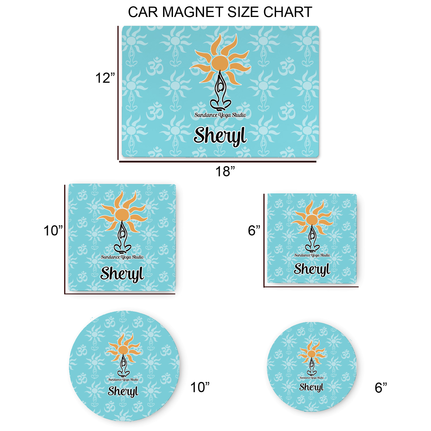 Your personalized car magnets are available for purchase in two shapes and two sizes. We carry round and square editions; each shape can either be 6 by 6 inches, or 10 by 10 inches, depending on your needs. Both versions are 1 millimeter thick, which is considered, within the industry, as the ideal thickness for automobile magnets. The magnetic car decals will adhere to any smooth, metal surface of your cars body, such as the trunk door or a side panel. However, please note that some vehicles are constructed from fiberglass bodies, which prevents the adhesion of anything magnetic. We advise that you test your vehicle before purchasing these magnets.