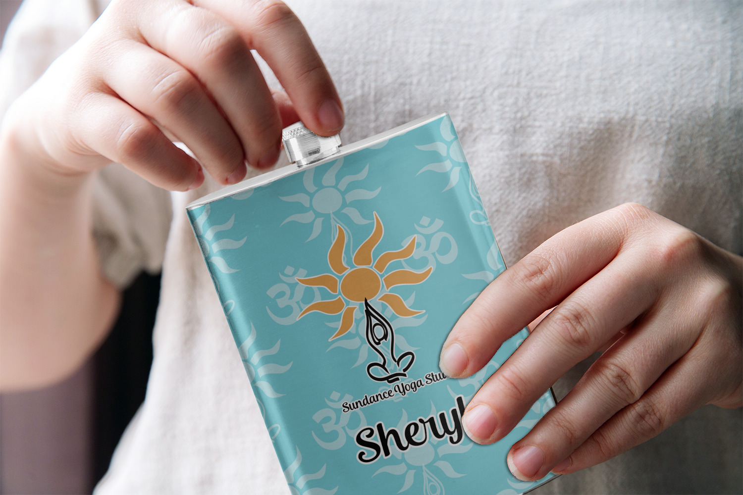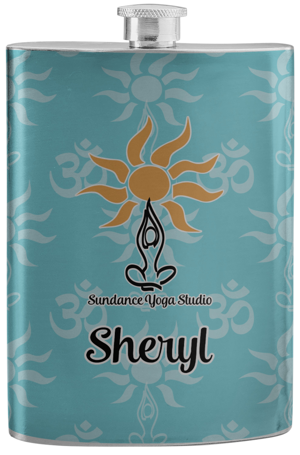 This calming design is dominantly a gorgeous light teal with the the Sundance logo, as well as the om symbol, repeating in the background. The main logo is prominently displayed front and center. The logo is a simple drawing of a figure doing the lotus pose with a sun rising above them. "Sundance Yoga Studio" is written beneath the logo. You personalization goes directly under the logo to create a finished design.