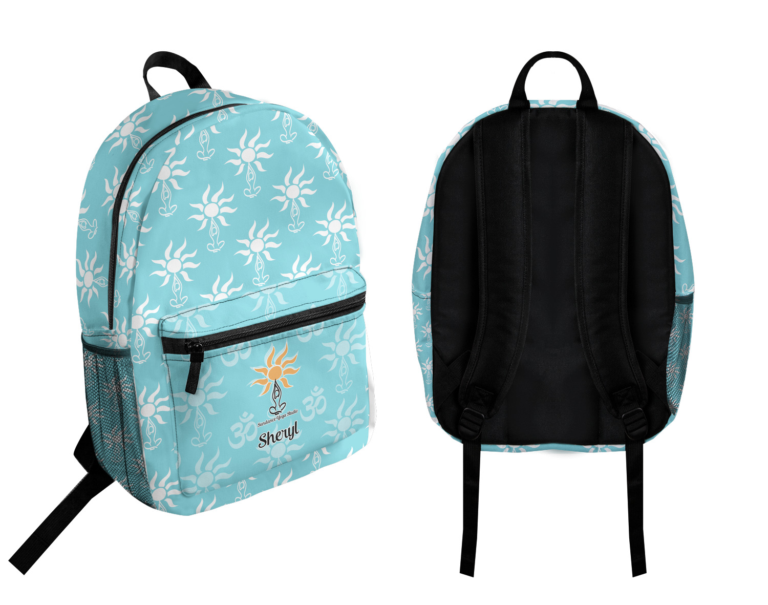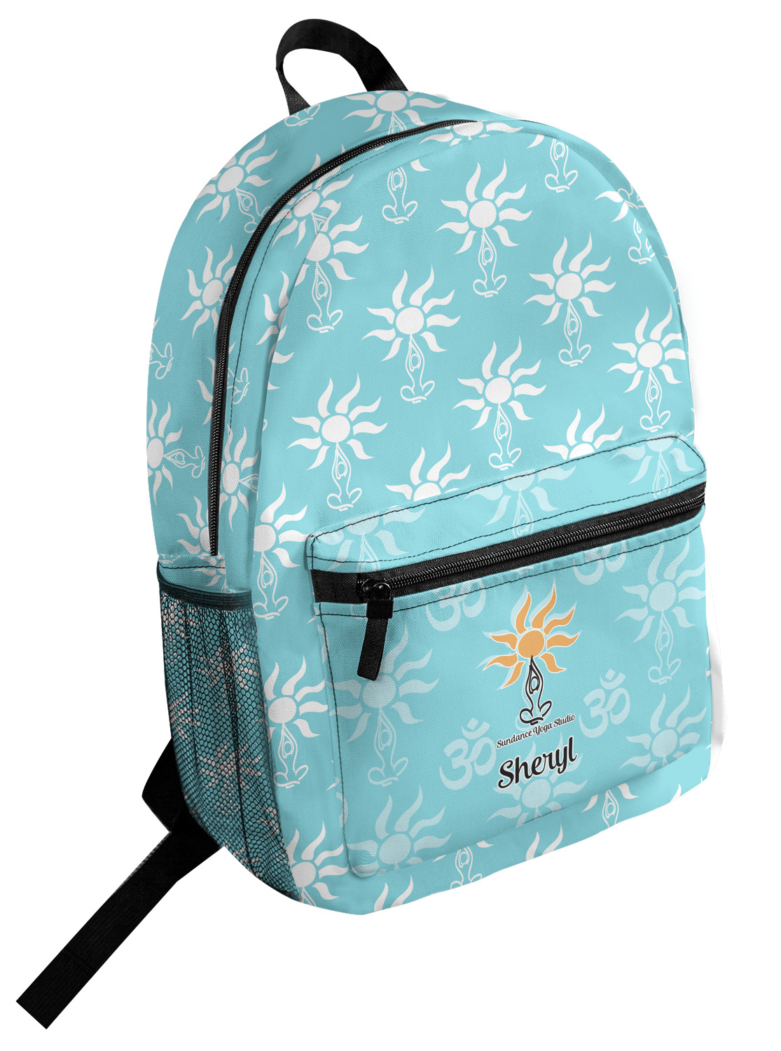This calming design is dominantly a gorgeous light teal with the the Sundance logo, as well as the om symbol, repeating in the background. The main logo is prominently displayed front and center. The logo is a simple drawing of a figure doing the lotus pose with a sun rising above them. "Sundance Yoga Studio" is written beneath the logo. You personalization goes directly under the logo to create a finished design.