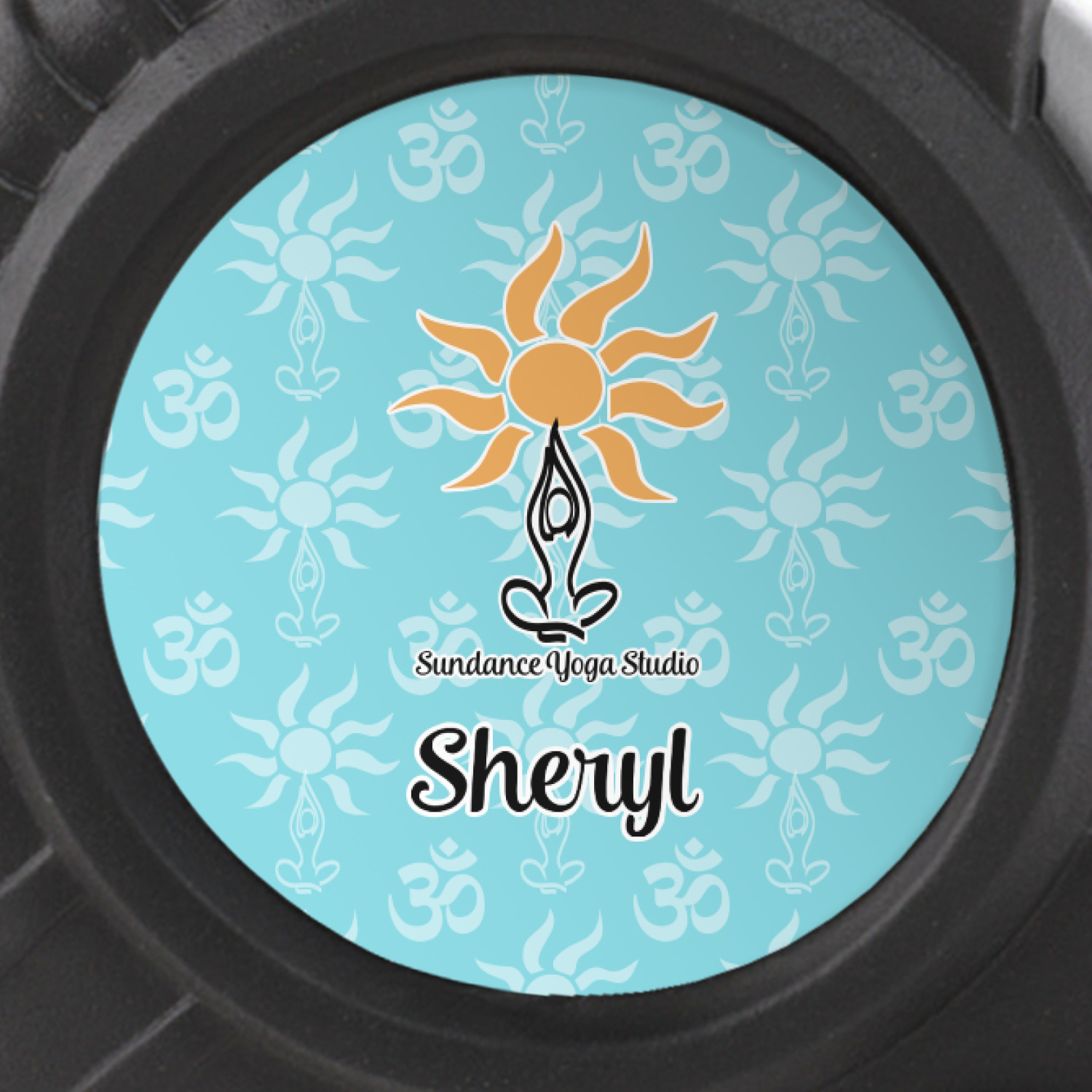 This calming design is dominantly a gorgeous light teal with the the Sundance logo, as well as the om symbol, repeating in the background. The main logo is prominently displayed front and center. The logo is a simple drawing of a figure doing the lotus pose with a sun rising above them. "Sundance Yoga Studio" is written beneath the logo. You personalization goes directly under the logo to create a finished design.