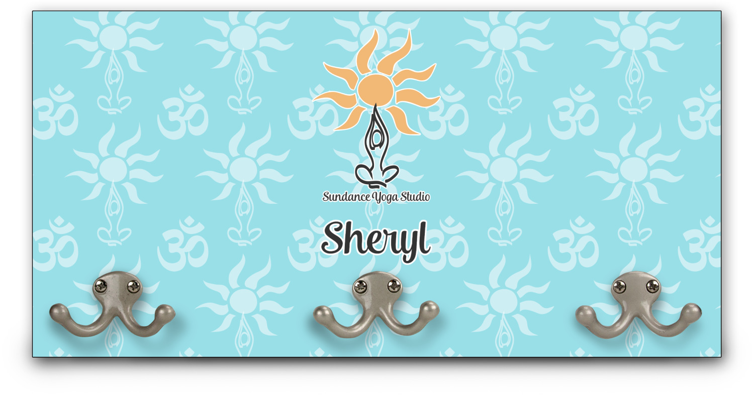 This calming design is dominantly a gorgeous light teal with the the Sundance logo, as well as the om symbol, repeating in the background. The main logo is prominently displayed front and center. The logo is a simple drawing of a figure doing the lotus pose with a sun rising above them. "Sundance Yoga Studio" is written beneath the logo. You personalization goes directly under the logo to create a finished design.