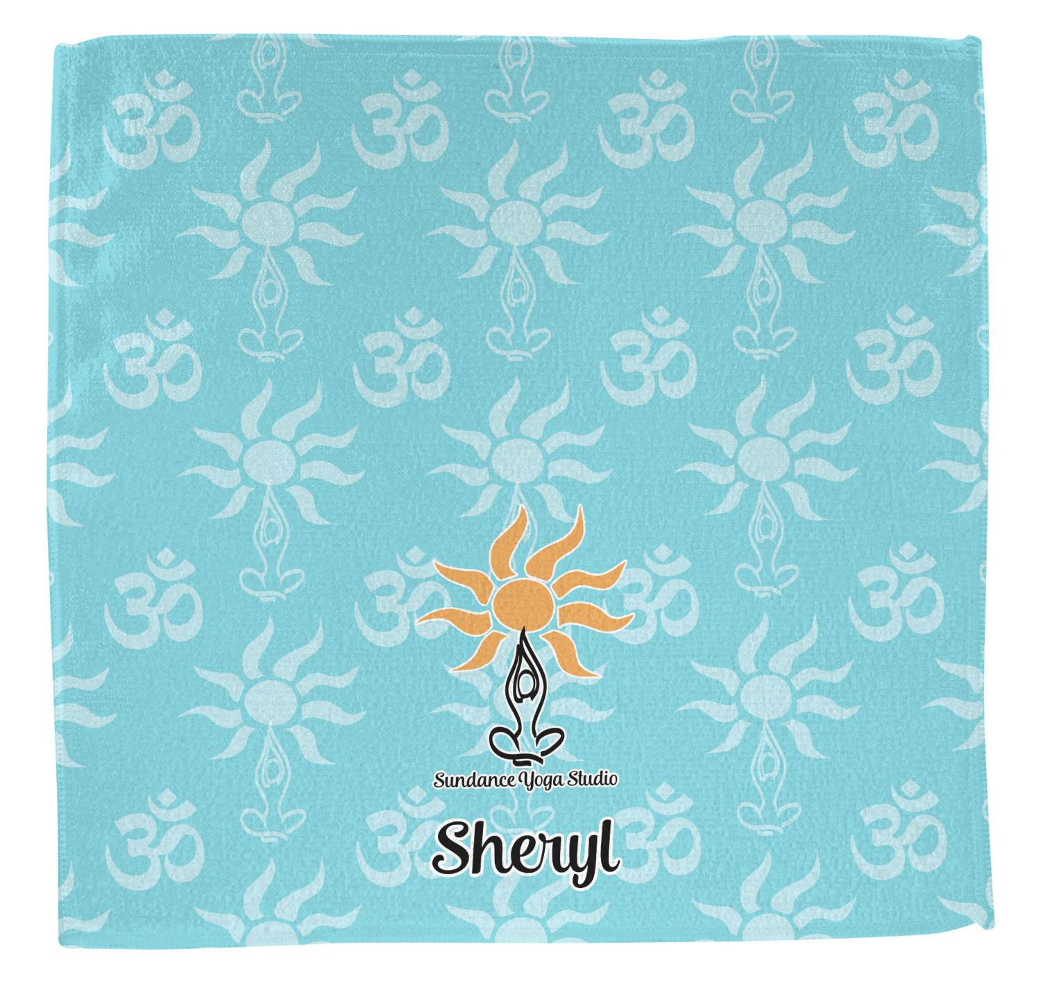 This calming design is dominantly a gorgeous light teal with the the Sundance logo, as well as the om symbol, repeating in the background. The main logo is prominently displayed front and center. The logo is a simple drawing of a figure doing the lotus pose with a sun rising above them. "Sundance Yoga Studio" is written beneath the logo. You personalization goes directly under the logo to create a finished design.