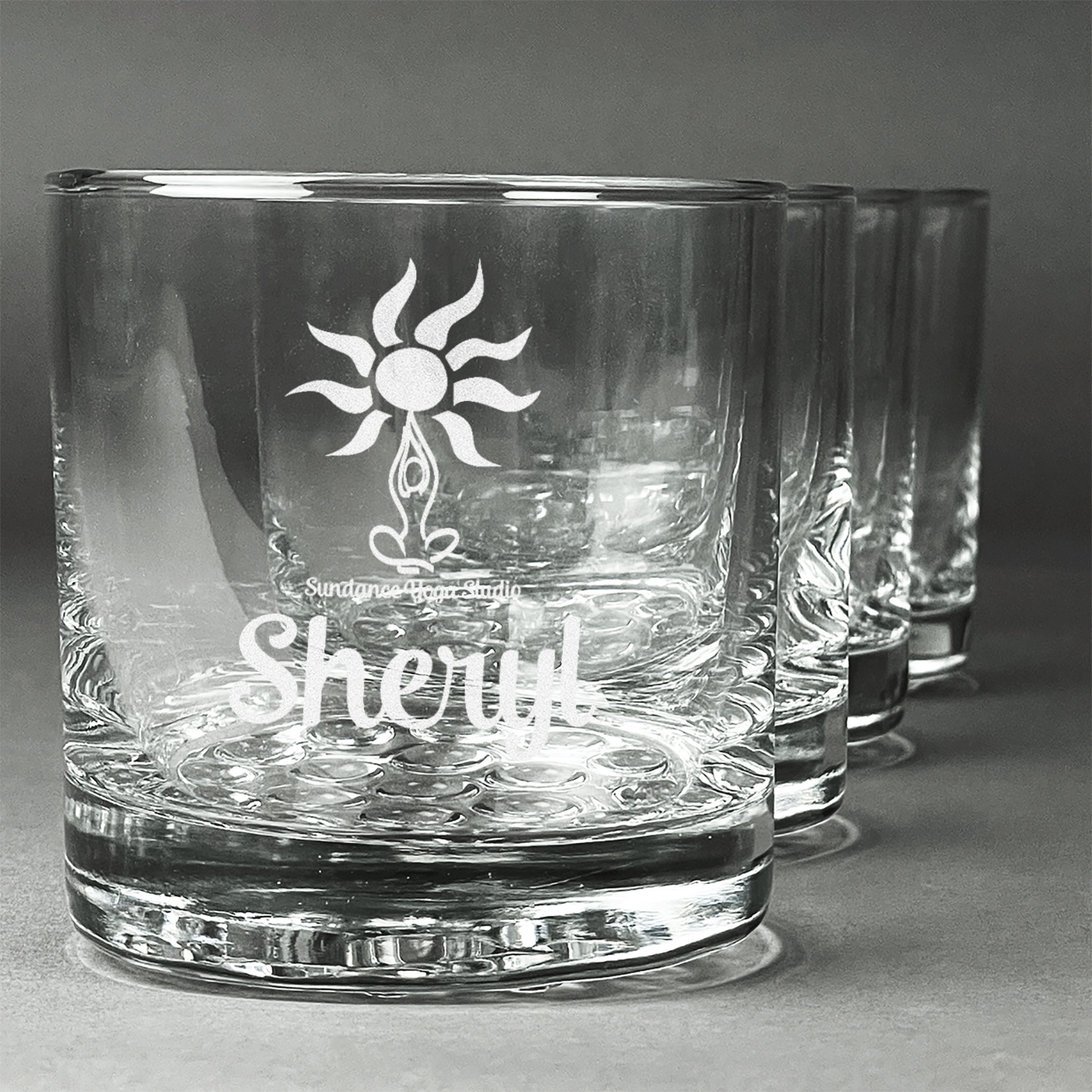 This calming design is dominantly a gorgeous light teal with the the Sundance logo, as well as the om symbol, repeating in the background. The main logo is prominently displayed front and center. The logo is a simple drawing of a figure doing the lotus pose with a sun rising above them. "Sundance Yoga Studio" is written beneath the logo. You personalization goes directly under the logo to create a finished design.