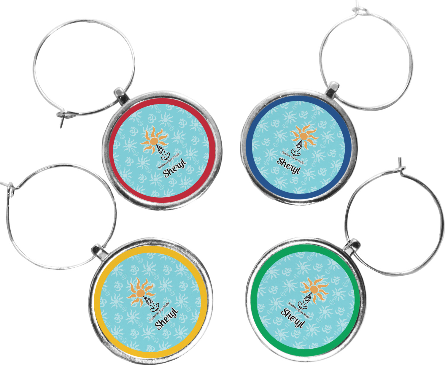 Your wine glass markers are comprised of a circular zinc plate with a 1.25 inch diameter. The zinc plate hangs from a zinc loop, which can be easily secured and removed from the stem of a wine glass. Your customized design is printed onto a 1 inch diameter insert, and then placed into the wine glass charm itself. Though sold in a set of four, you can personalize each charm individually and change the colors of the ring around your design, depending on your needs.
