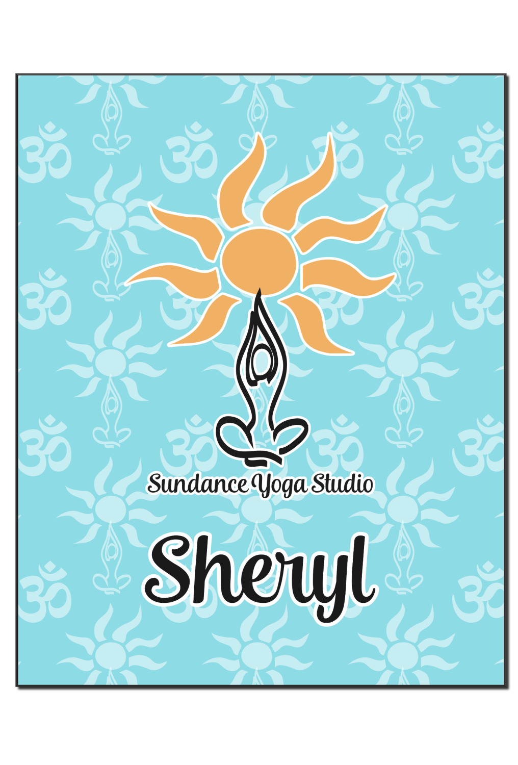 This calming design is dominantly a gorgeous light teal with the the Sundance logo, as well as the om symbol, repeating in the background. The main logo is prominently displayed front and center. The logo is a simple drawing of a figure doing the lotus pose with a sun rising above them. "Sundance Yoga Studio" is written beneath the logo. You personalization goes directly under the logo to create a finished design.