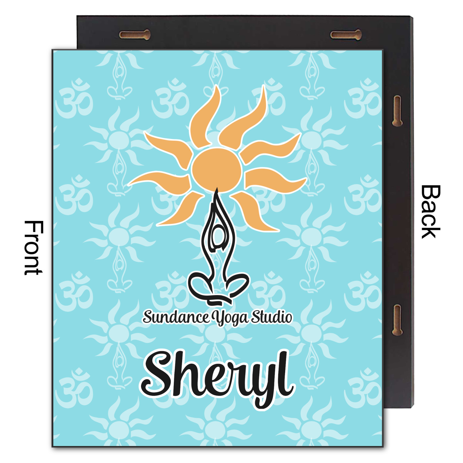 This calming design is dominantly a gorgeous light teal with the the Sundance logo, as well as the om symbol, repeating in the background. The main logo is prominently displayed front and center. The logo is a simple drawing of a figure doing the lotus pose with a sun rising above them. "Sundance Yoga Studio" is written beneath the logo. You personalization goes directly under the logo to create a finished design.