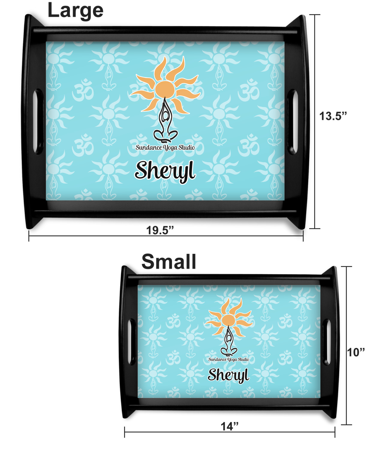 This serving tray with handles features square edges and two rounded sides, creating a very modern look. Each side is fabricated from a beautifully cut, natural wood. The bottom of the interior of the tray displays your customized design in bright, vibrant color. The tray is sold in both a black color and a natural wood look. Each variation of the wood serving tray has two sizes: Small, which is 14" x 10" x 2.25", and Large, which is 19.5" x 13.5" x 2.75".
