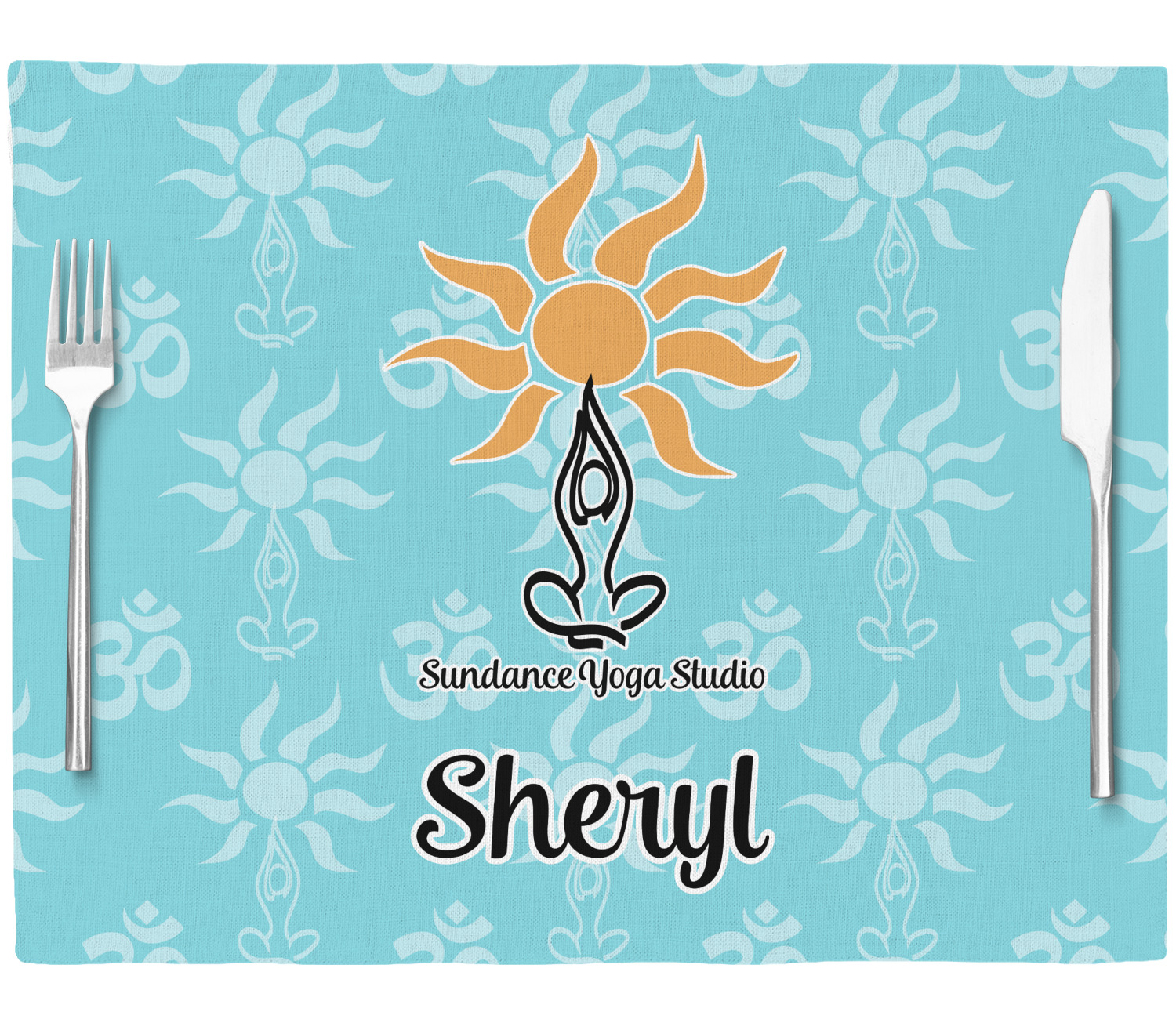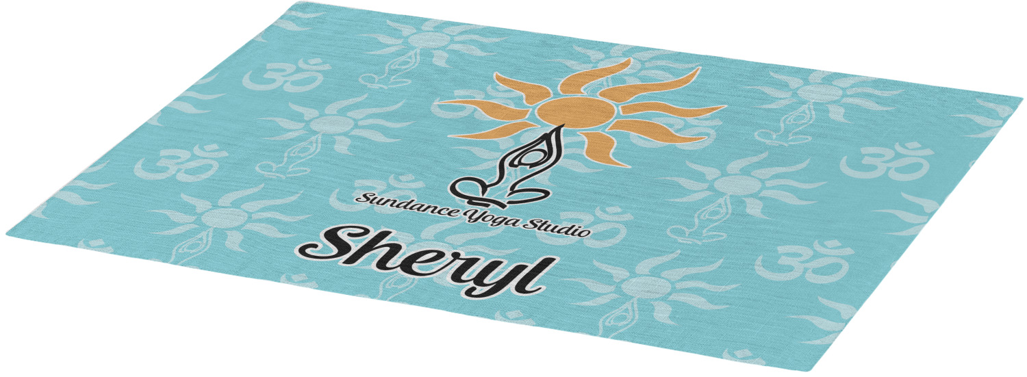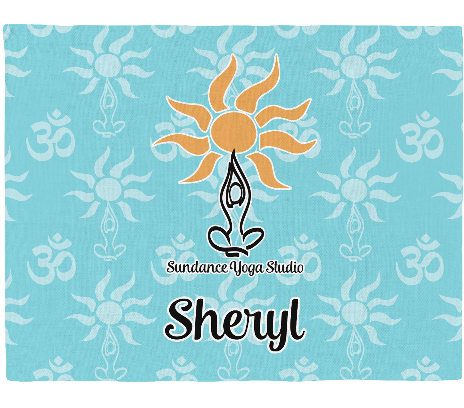 This calming design is dominantly a gorgeous light teal with the the Sundance logo, as well as the om symbol, repeating in the background. The main logo is prominently displayed front and center. The logo is a simple drawing of a figure doing the lotus pose with a sun rising above them. "Sundance Yoga Studio" is written beneath the logo. You personalization goes directly under the logo to create a finished design.