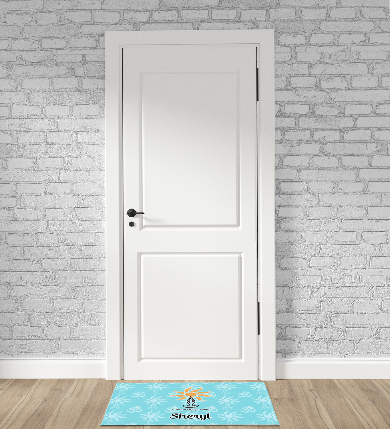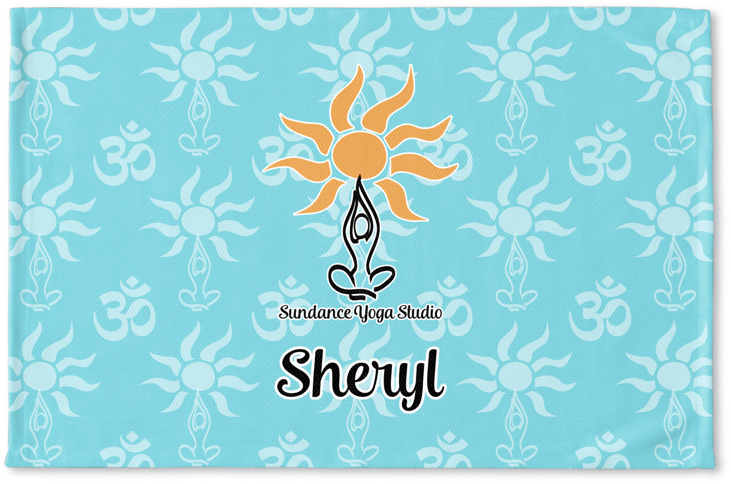 This calming design is dominantly a gorgeous light teal with the the Sundance logo, as well as the om symbol, repeating in the background. The main logo is prominently displayed front and center. The logo is a simple drawing of a figure doing the lotus pose with a sun rising above them. "Sundance Yoga Studio" is written beneath the logo. You personalization goes directly under the logo to create a finished design.