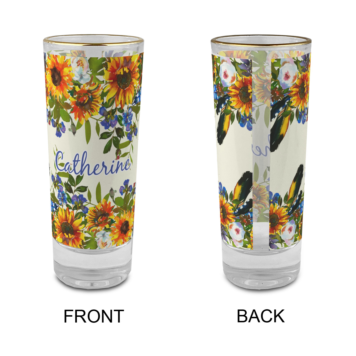 These glass shooter glasses are printed in full color with the design of your choice. These are a tall shooter 2 oz size and stand 4" tall. The print is a full wrap design to boldly display your personalization.