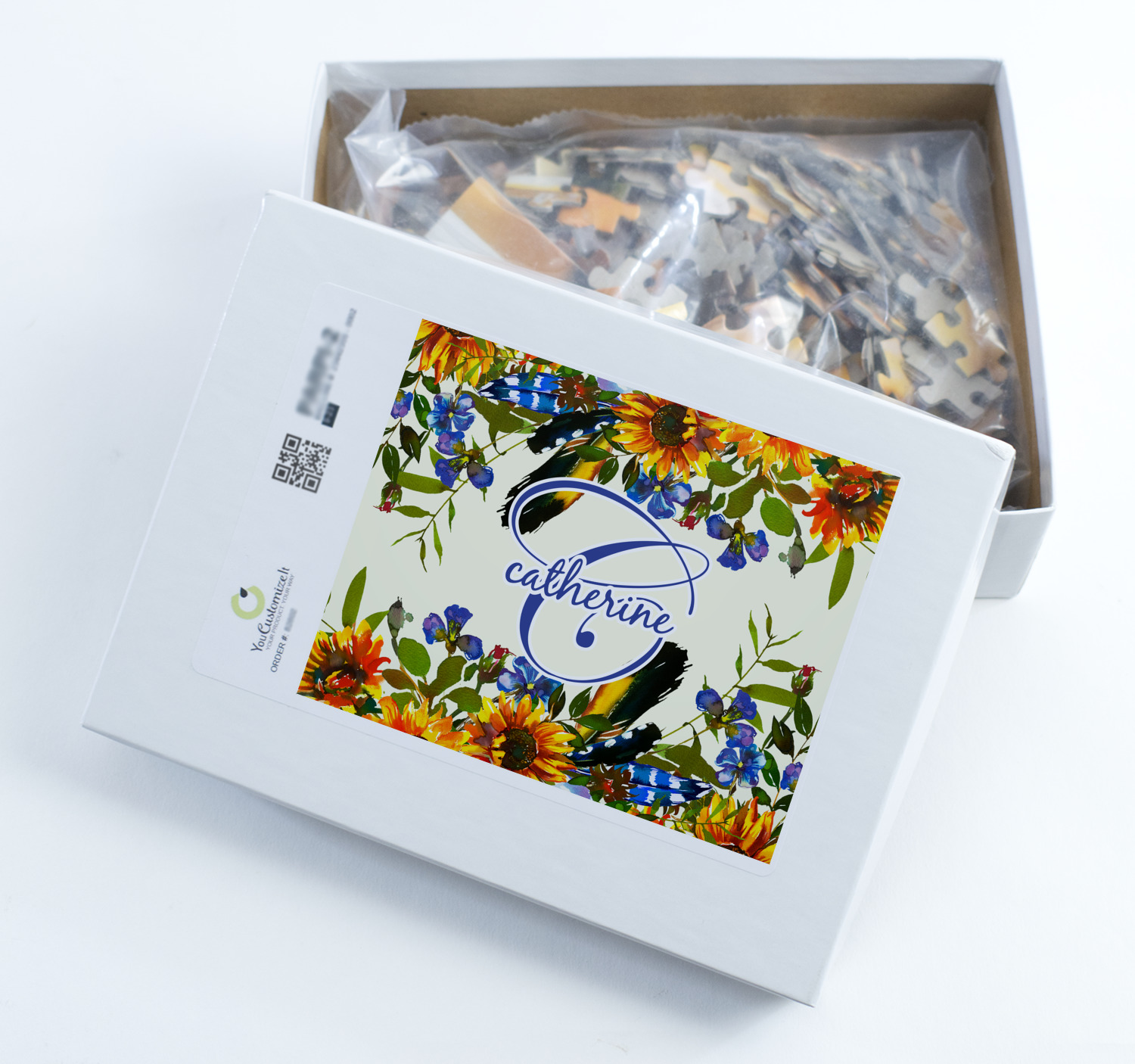 We print our puzzles on thick white chipboard in vibrant colors, then laminate the chipboard and die cut your puzzle. Your jigsaw puzzle is shipped to you in a box with the image of the puzzle on the box.