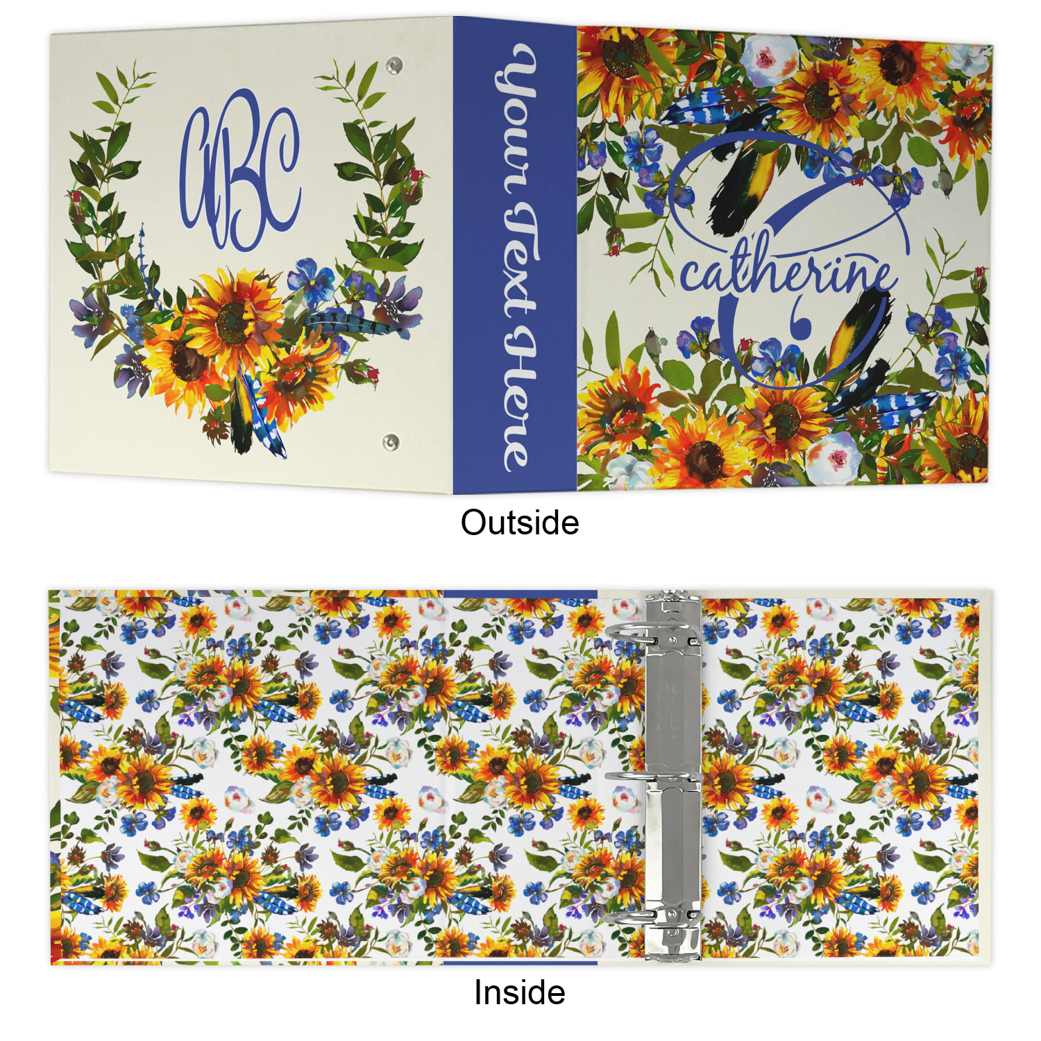 Made from a sturdy cardboard base with a full high quality canvas textured vinyl wrap with the design of your choice. Unlike our standard 3-ring binder with the full wrap design your artwork wraps from the front and back and into the inside of the binder.