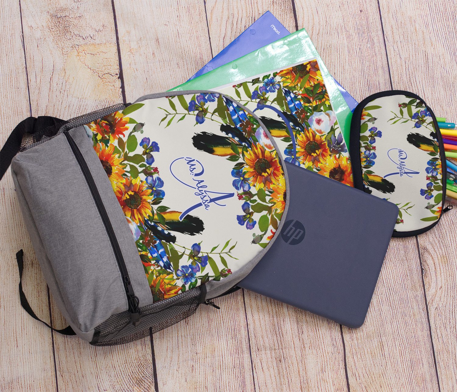 This sunflowers design template is simply beautiful. We chose to personalize it with a name & initial for the main design. We used the blue from the flower in the design and a really pale yellow background.