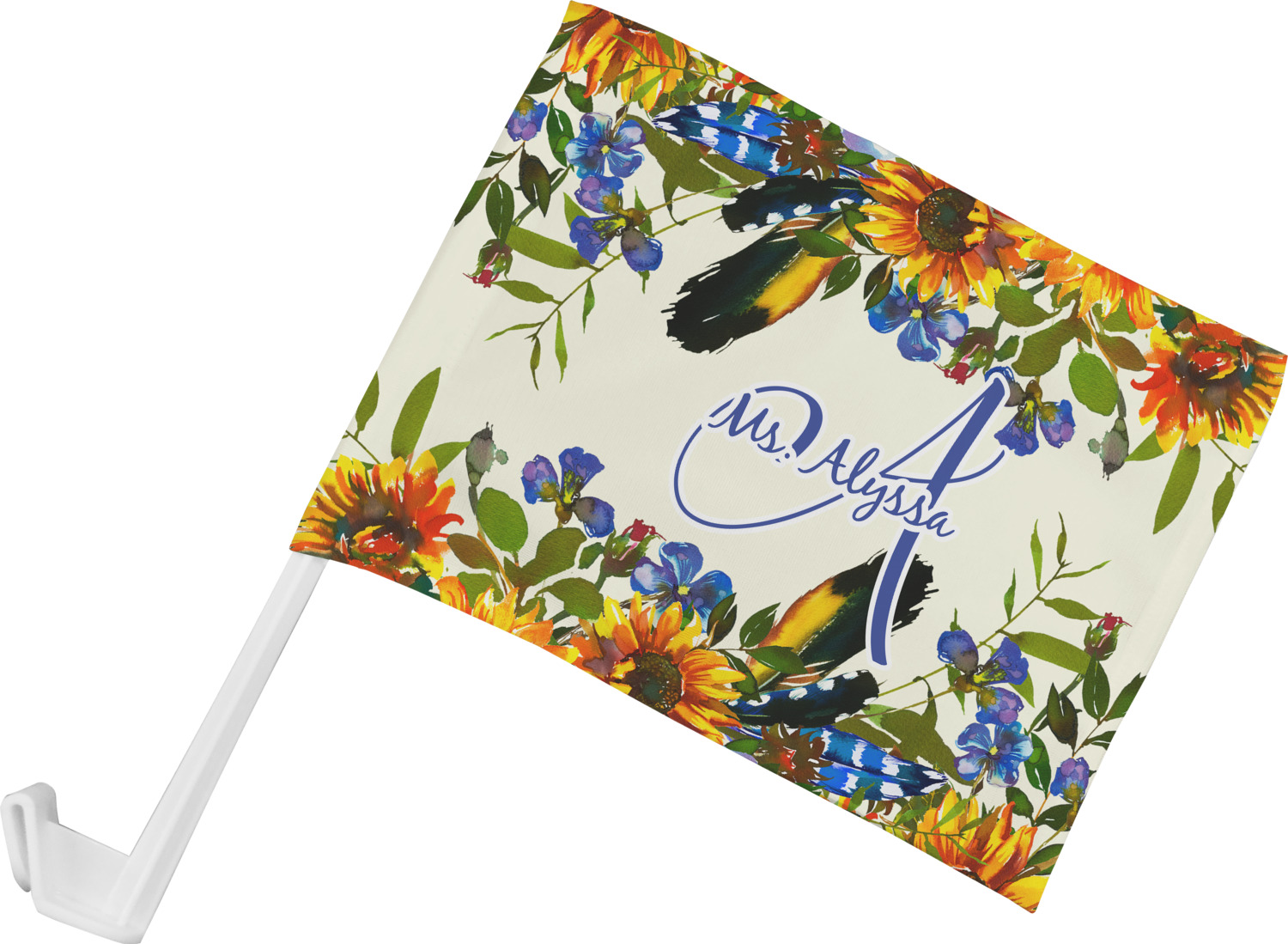 Our personalized flags are made from a durable, yet lightweight cloth that will proudly bear your logo or design of choice, while withstanding the outside elements. We have two size options - 8" x 11" and 11" x 15". Both come with a flag pole which includes a clip that secures the pole to the side window, whether it is rolled up or down. The flags are printed on both sides to display your design from all directions.