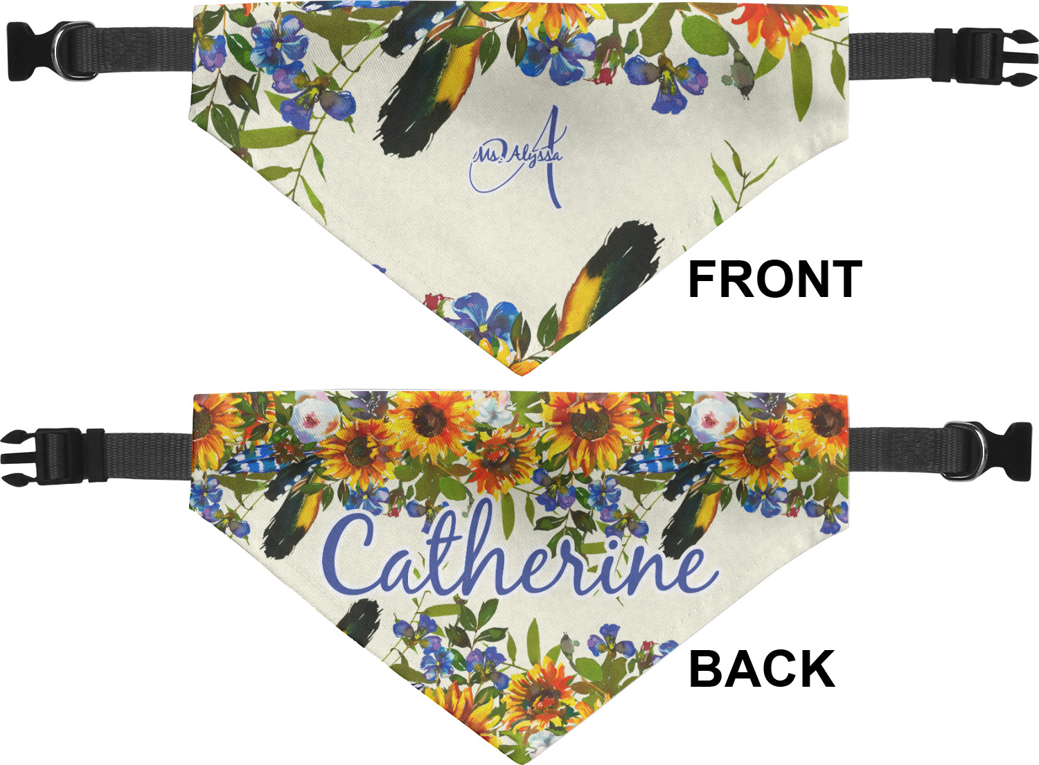 We print the front and back of these dog bandanas with your customized design. The bandana itself is made from a durable polyester, sewn together with a gap large enough to accommodate any collar. Regardless, the bandana includes a plain black, canvas collar with plastic snaps, that can easily be removed if desired. These dog bandana collars are available in four sizes: small, medium, large, and extra large. Please see our sizing chart for more information regarding the dimensions of each size.