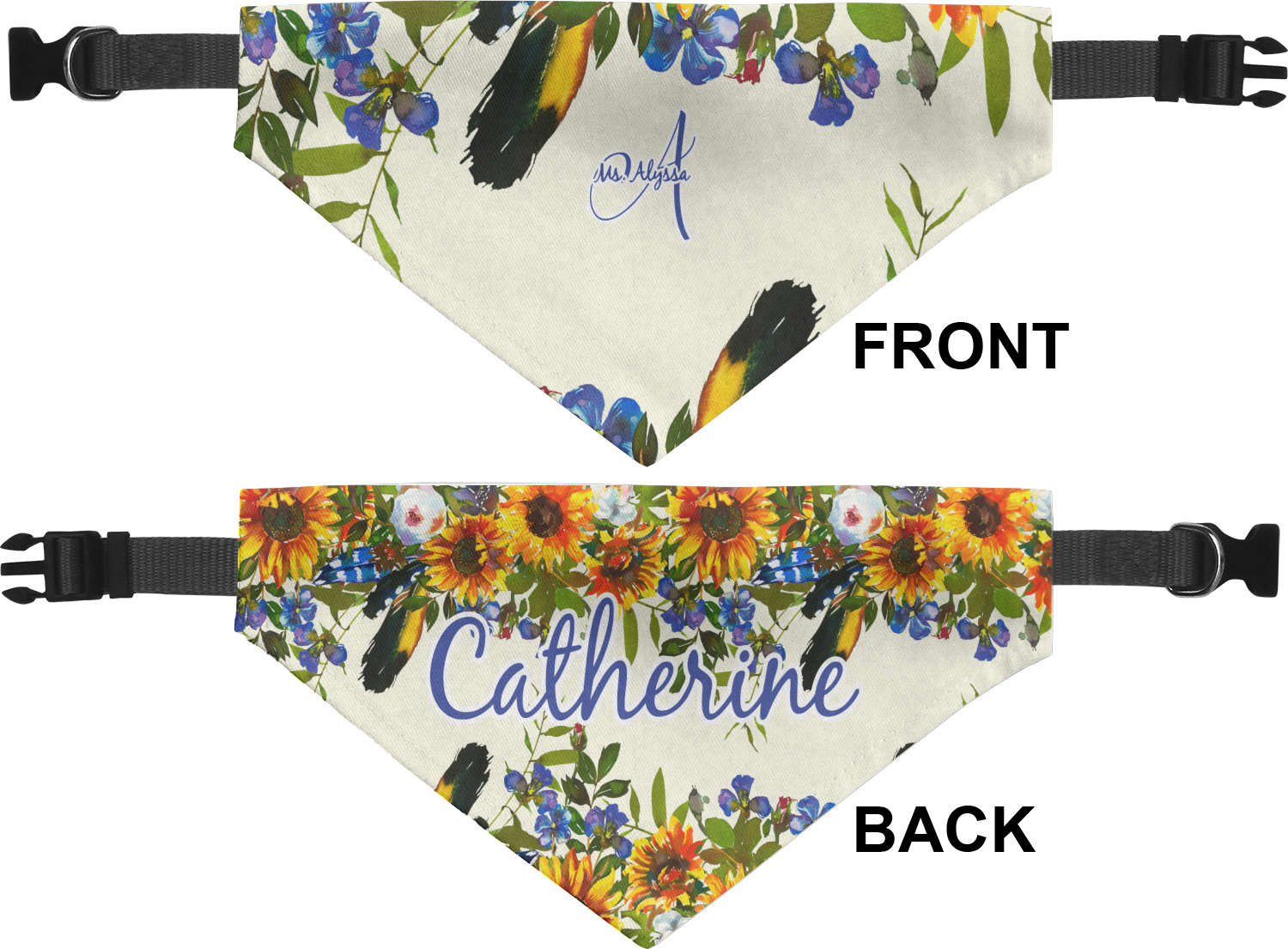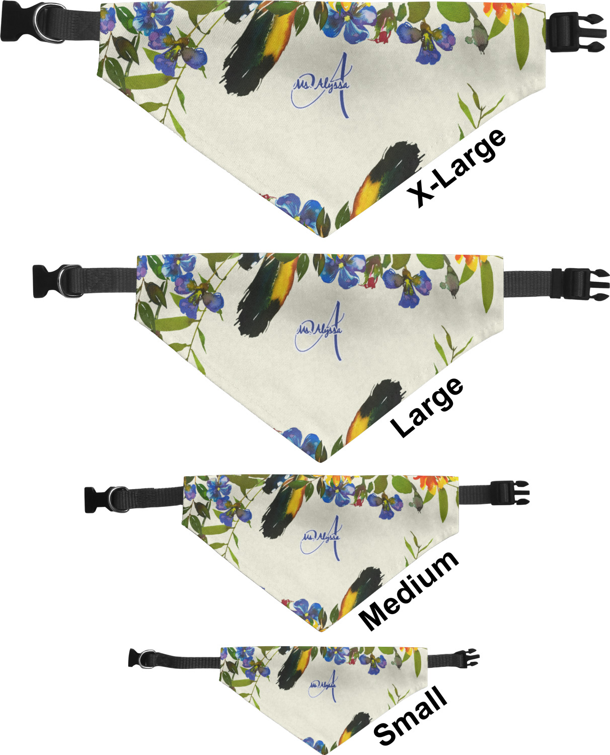 We print the front and back of these dog bandanas with your customized design. The bandana itself is made from a durable polyester, sewn together with a gap large enough to accommodate any collar. Regardless, the bandana includes a plain black, canvas collar with plastic snaps, that can easily be removed if desired. These dog bandana collars are available in four sizes: small, medium, large, and extra large. Please see our sizing chart for more information regarding the dimensions of each size.