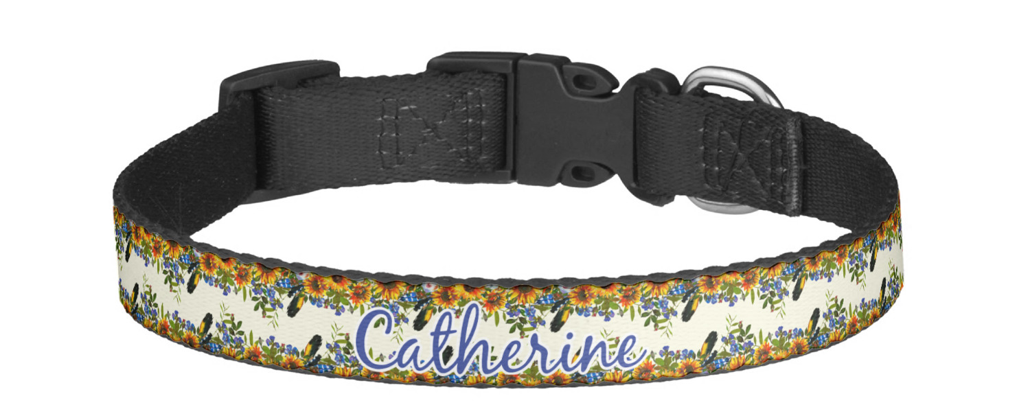 This sturdy collar, made from a durable nylon weave, will outlive your dog's episodes of excited tugging and pulling. Courtesy of its thick plastic buckle and adjuster, this collar is adjustable and accommodating of any dog. Structurally, the collar is a single piece of nylon weave that is sewn together, and features a solid metal loop where you can attach a leash or dog tag. We print and display your dog's name and pattern across the middle of the personalized dog collar.