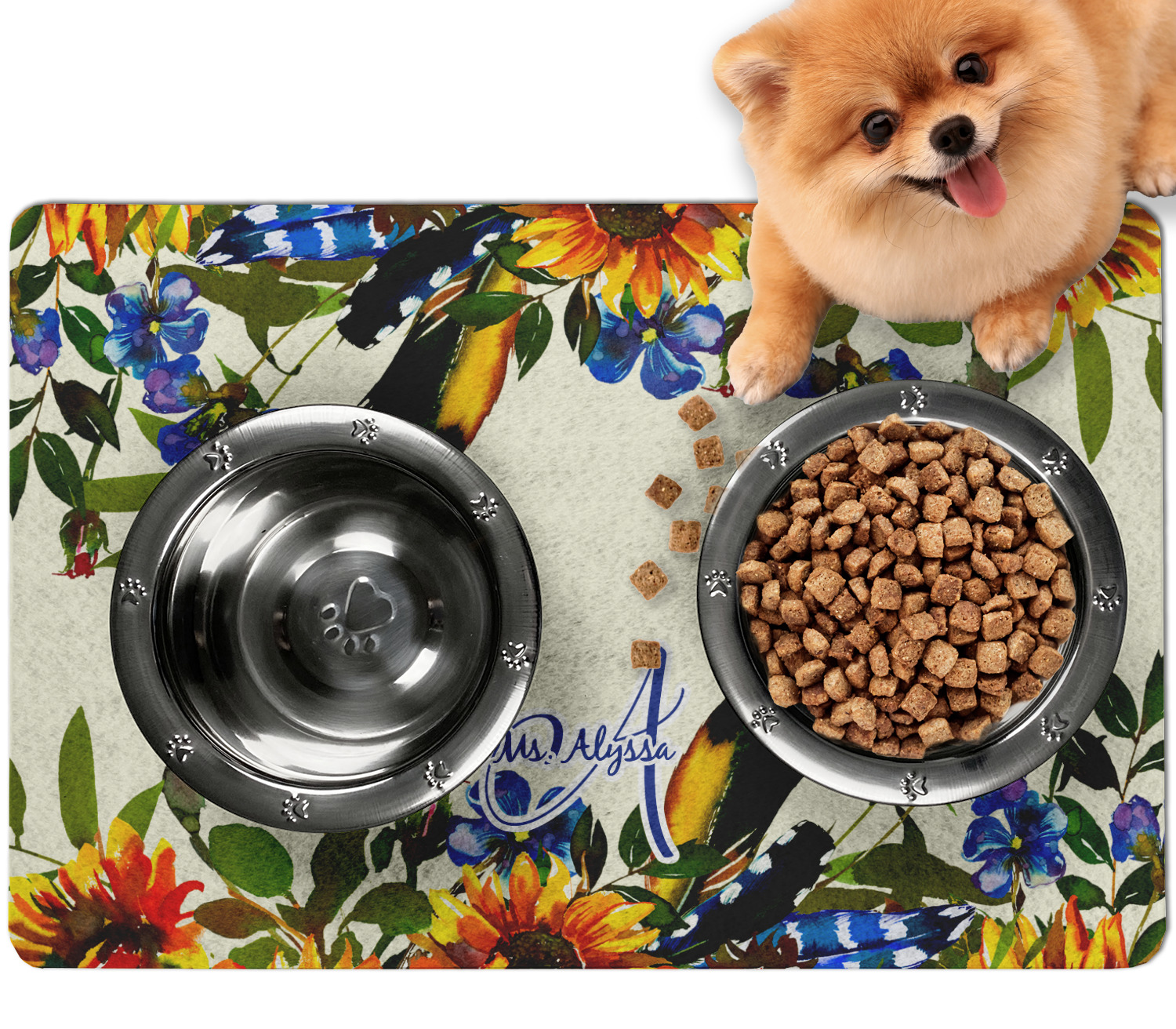 Frustrated with the mess your pets make during mealtime? Personalize a multi-functional dog food mat that prevents spills from reaching your floors, while also incorporating some cute decor to your dog's eating area!
