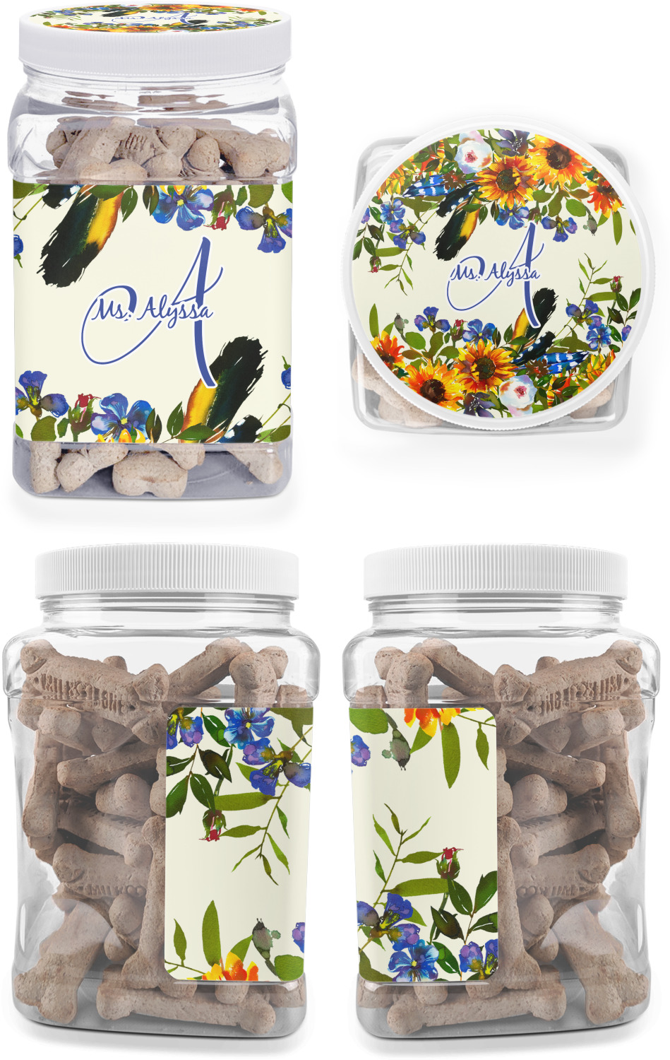 This half gallon jar, made from a sturdy plastic, is the perfect way to keep treats from any naughty pet paws, while still keeping them ready on hand for when your pup performs an impressive trick. This dog cookie jar features a screw-on, white lid that displays your personalized design on a vinyl sticker. We apply another customized sticker that wraps around the front and sides of the jar. Our dog treat jar also has indentations on the rear ends of the sides, which allows for convenient handling, and its square frame allows for easy storage.