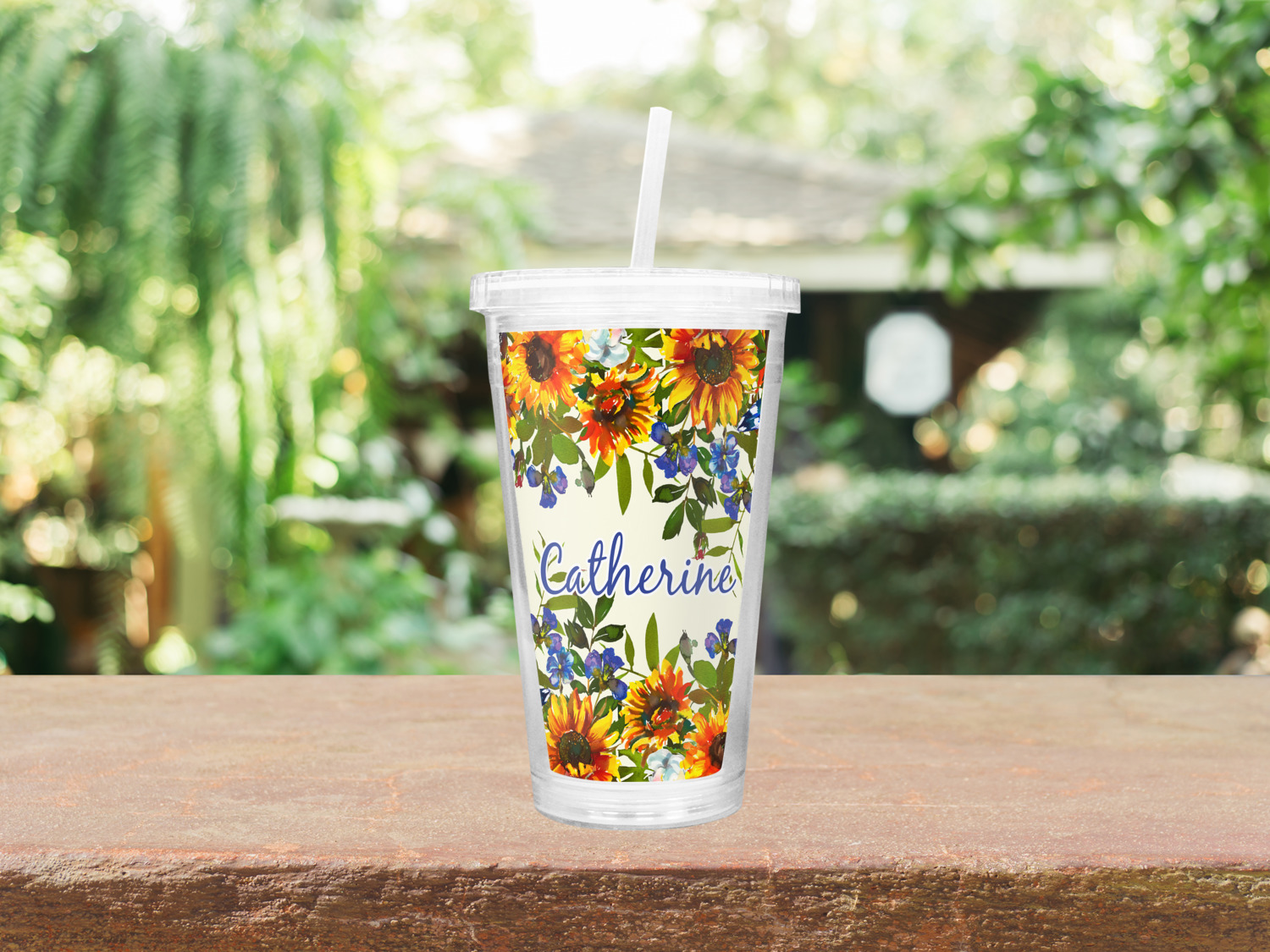 These BPA free tumblers with their double walls keep your drink cold and will not sweat on the outside; they have a clear acrylic top and a reusable straw with a ring around the bottom to keep the straw from falling out.
