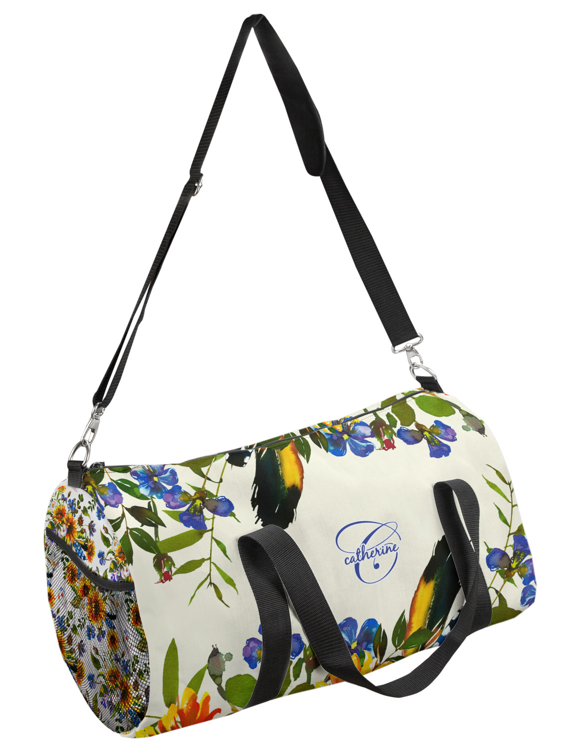This duffle is a sturdy bag made of a canvas material. It comes in two sizes: Small (19"W x 9.5"H x 9.5"D) and Large (23"W x 12"H x 12"D). The bag is a cylindrical shape with a black adjustable strap and two handles. On one side is an elastic pouch to put a waterbottle or other small item. Your product will be sublimated with your design and is able to be designed on the front, back, and sides. Be sure to remember that the straps may cut into parts of your design if you upload your own artwork.