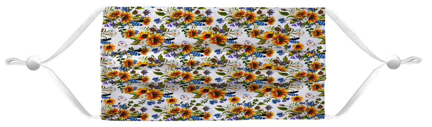 These fun face masks are 7" wide and 3.5" high. They feature pleats, adjustable ear loops, and are made with two layers of fabric. The top layer where your design is printed is a breathable polyester sheeting, while the inside layer is a soft microfiber polyester