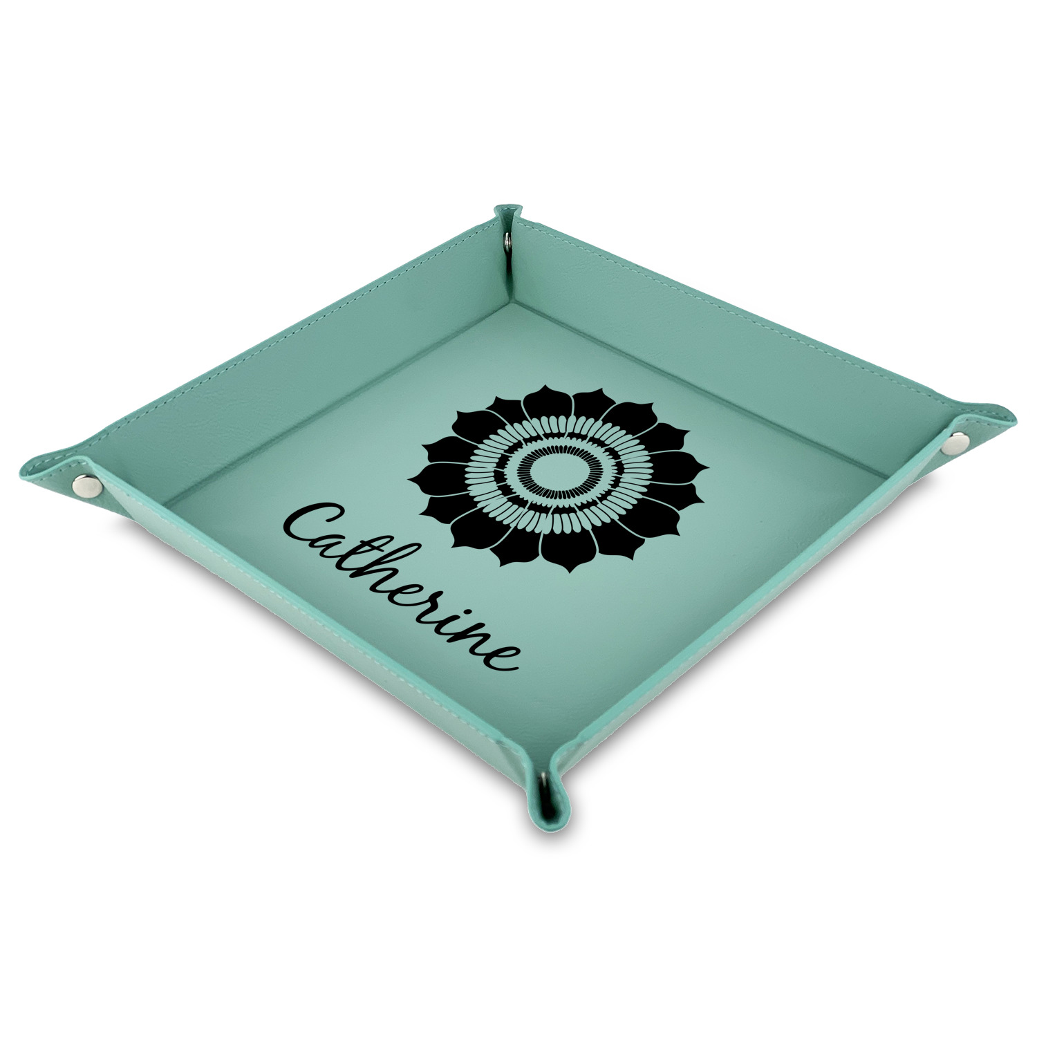 The leatherette wraps the hard board base and sides with flexible hinges to fold the sides up. The corners are secured using silver snaps. The 6in x 6 in tray measures approximately 9.5in x 9.5in when laid flat. The 9in x 9in tray measures approximately 13in x 13in when laid flat.