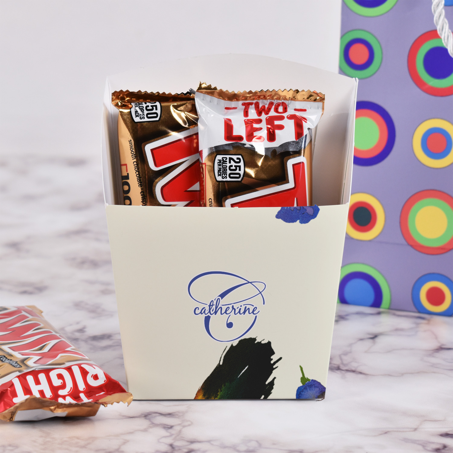 These french fry favor boxes are a pretty good size i.e. 5.25" tall x 4.25" wide x 1..625" deep. If you are not good with dimensions - it easily fits 2 full size Twix bars, or it is the size of McDonald's large fries.