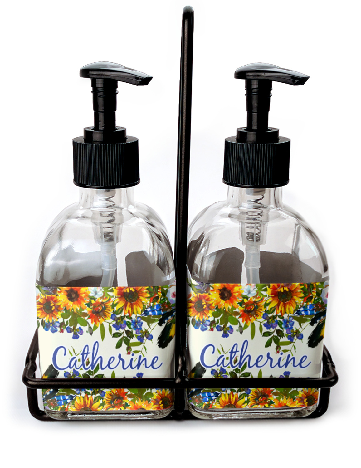You can purchase these personalized soap dispensers as singulars, or as a set with two bottles. With your purchase of the set, we include a black frame that complements the black color of the pumps and adds to the overall classy look of the piece.
