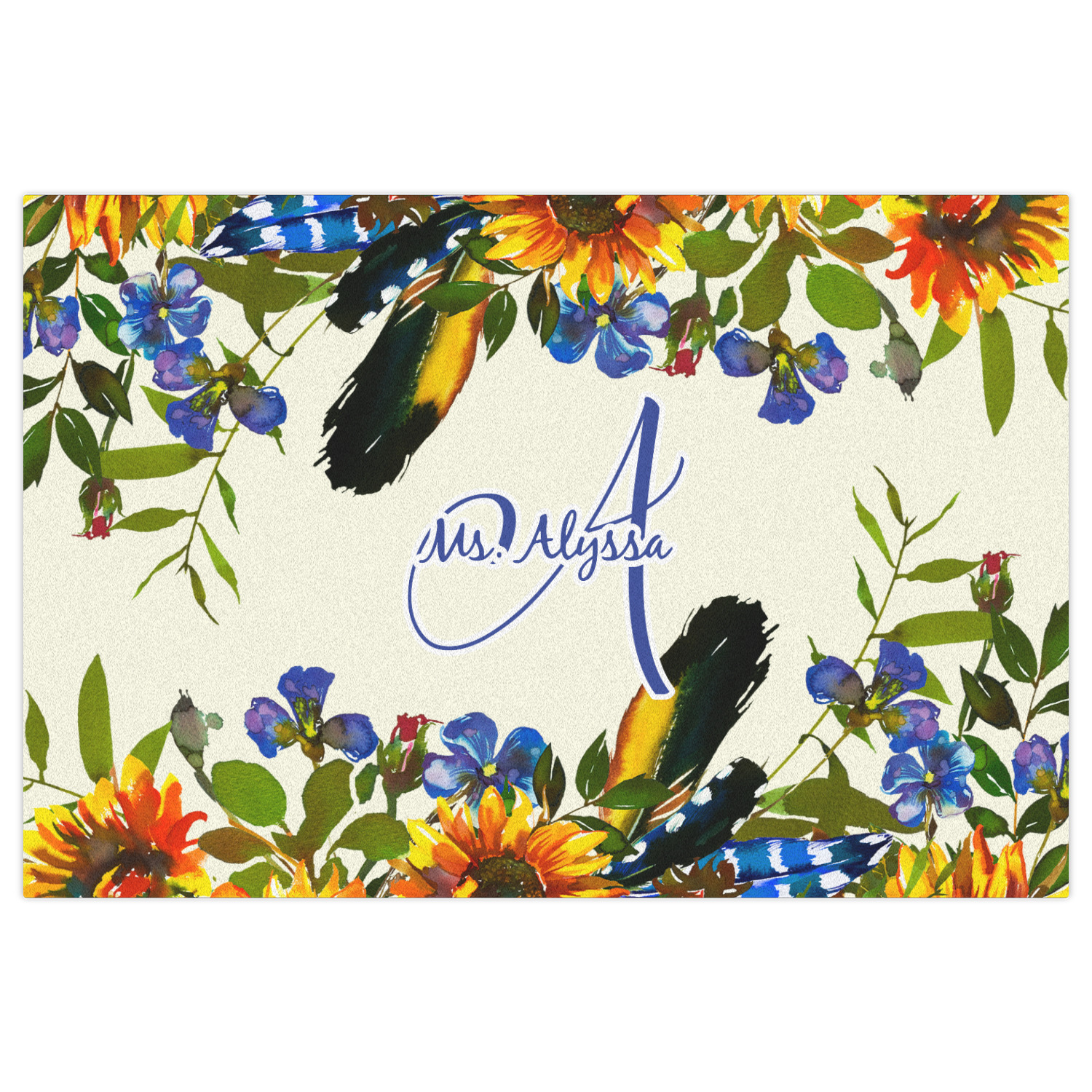 This sunflowers design template is simply beautiful. We chose to personalize it with a name & initial for the main design. We used the blue from the flower in the design and a really pale yellow background.