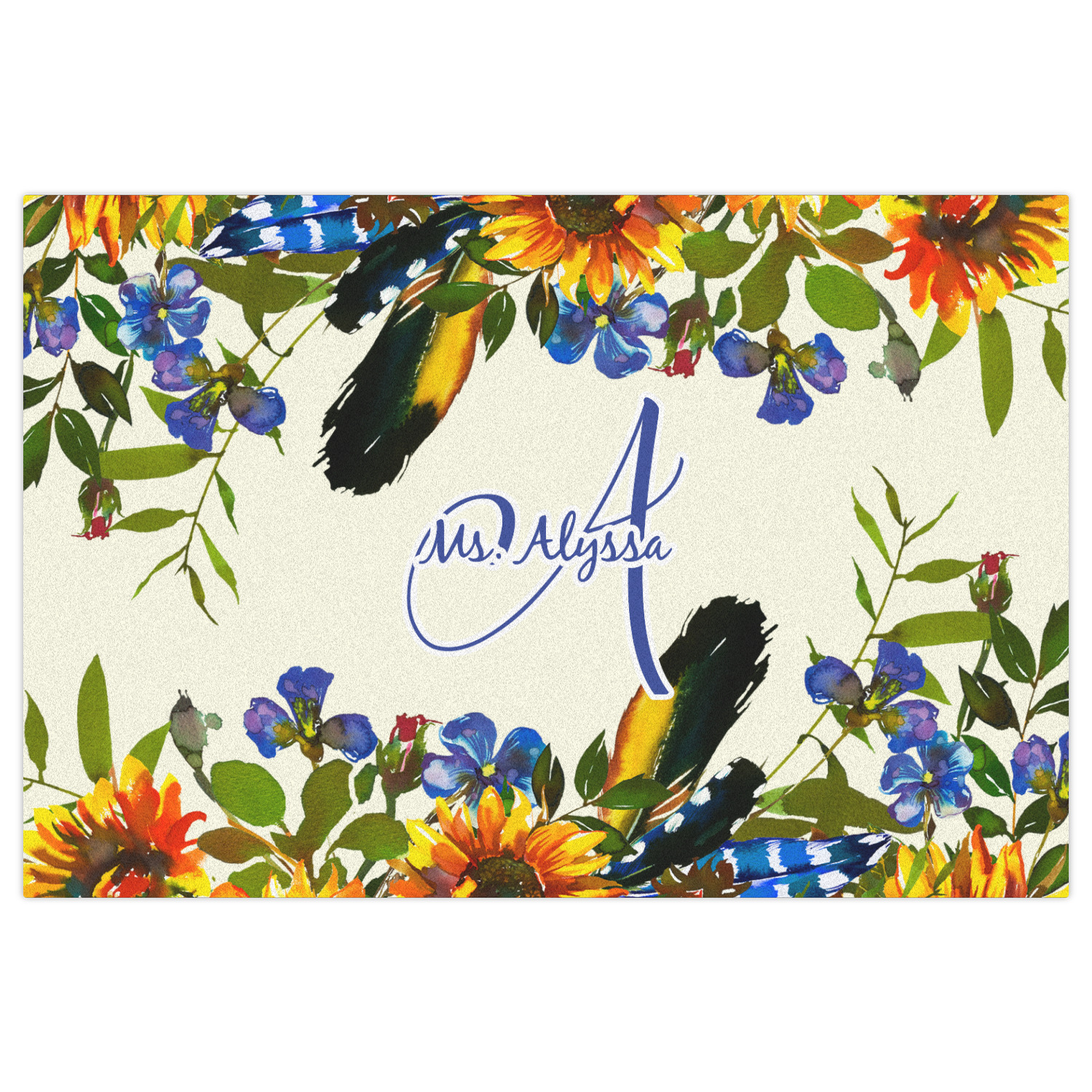 This sunflowers design template is simply beautiful. We chose to personalize it with a name & initial for the main design. We used the blue from the flower in the design and a really pale yellow background.